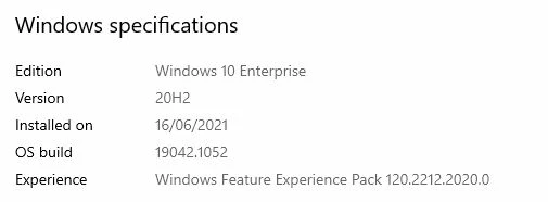 Windows: 10 Enterprise 20H2, OS build 19042.1052