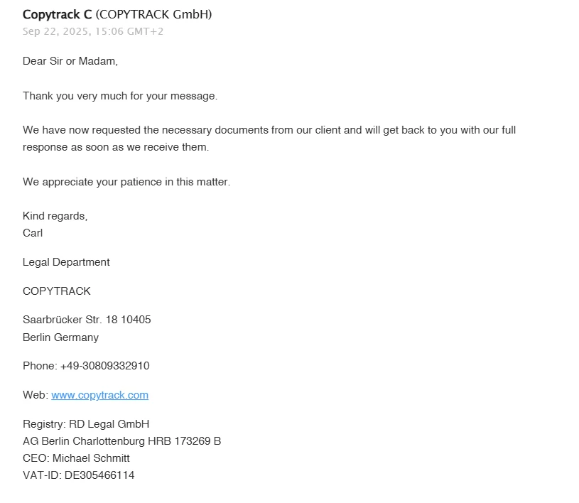 The image in question is AdobeStock_407400322 (attached). The company that contacted me is called COPYTRACK, email address is [Moderator deleted private information. Please do not post private information like e-mails and phone numbers], and they claim the rights holder is YayImages.