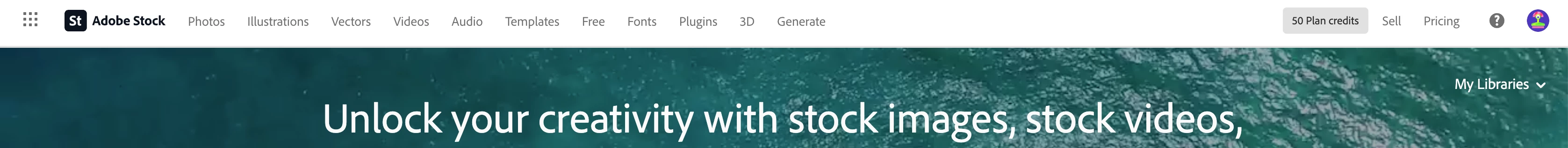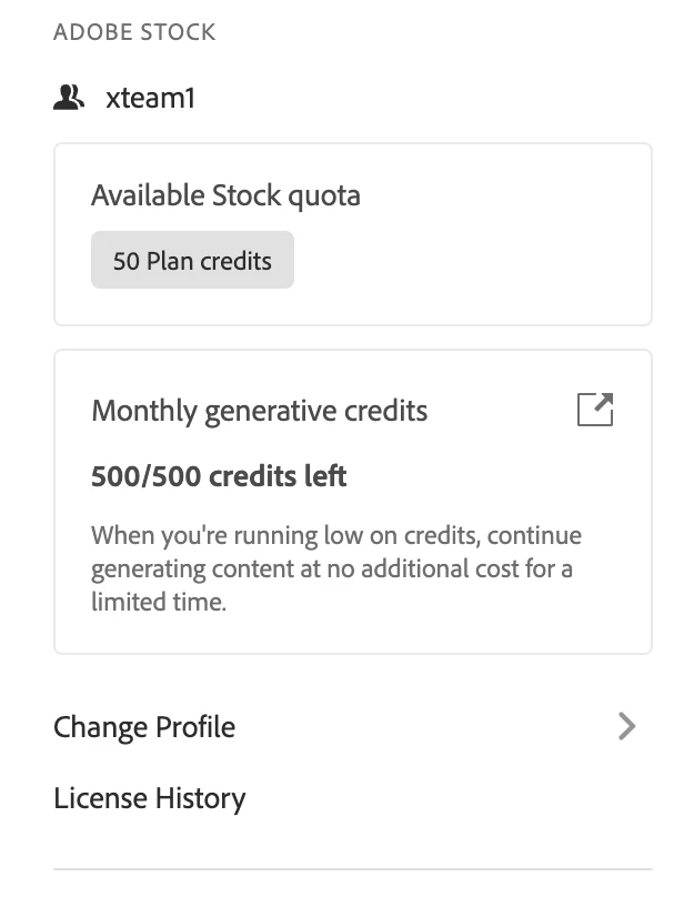 If you have an active Adobe Stock plan, the plan credits will be displayed separately as "Available Stock Quota" in the profile dropdown, as shown below. These plan credits indicate the remaining stock plan quota you have, which can be used for licensing various types of assets and If you have plan credits it will show on top nav bar as well like below: