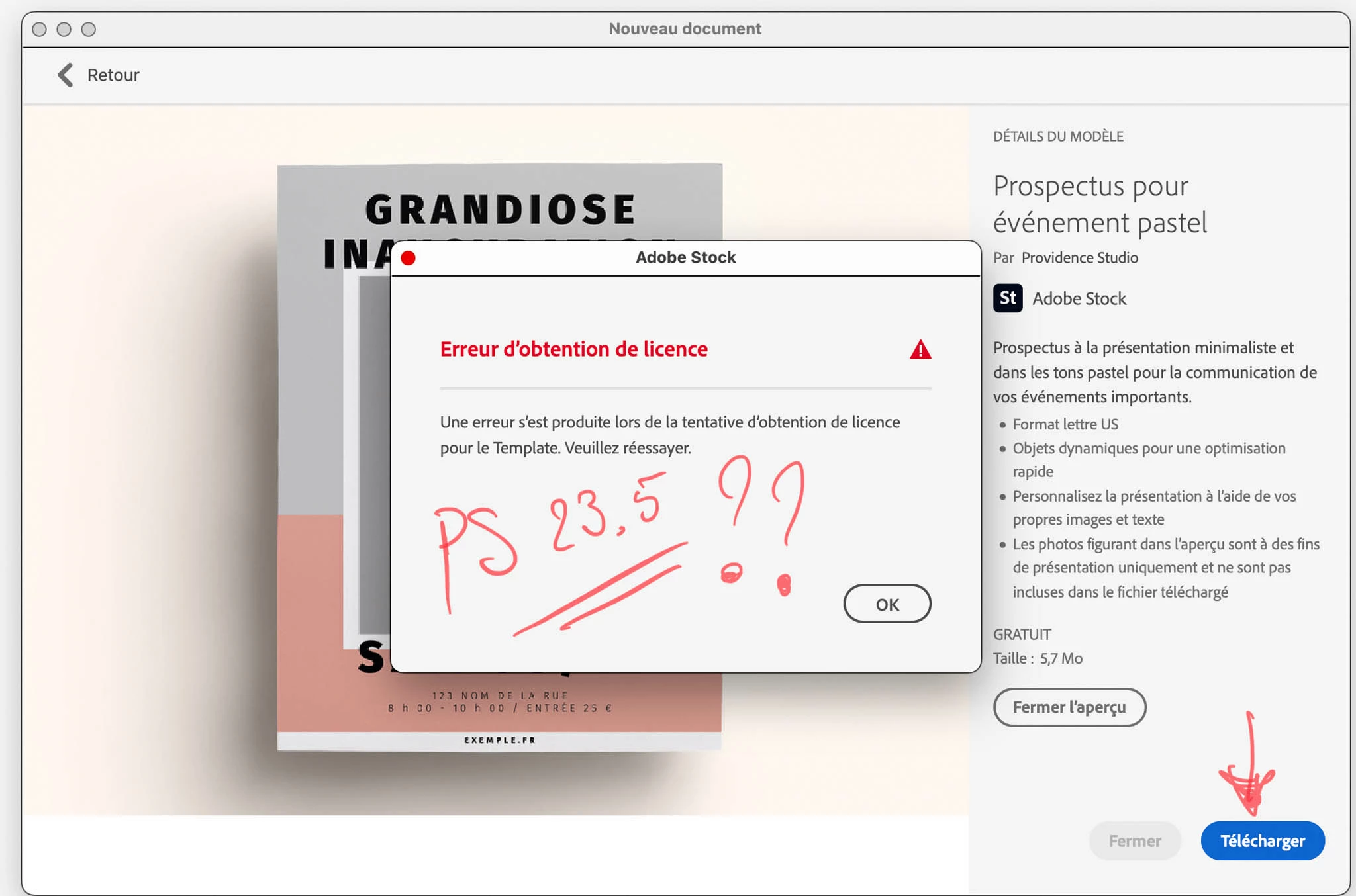 Voici le message d'erreur retourné quand je souhaite créer un document selon un modèle...