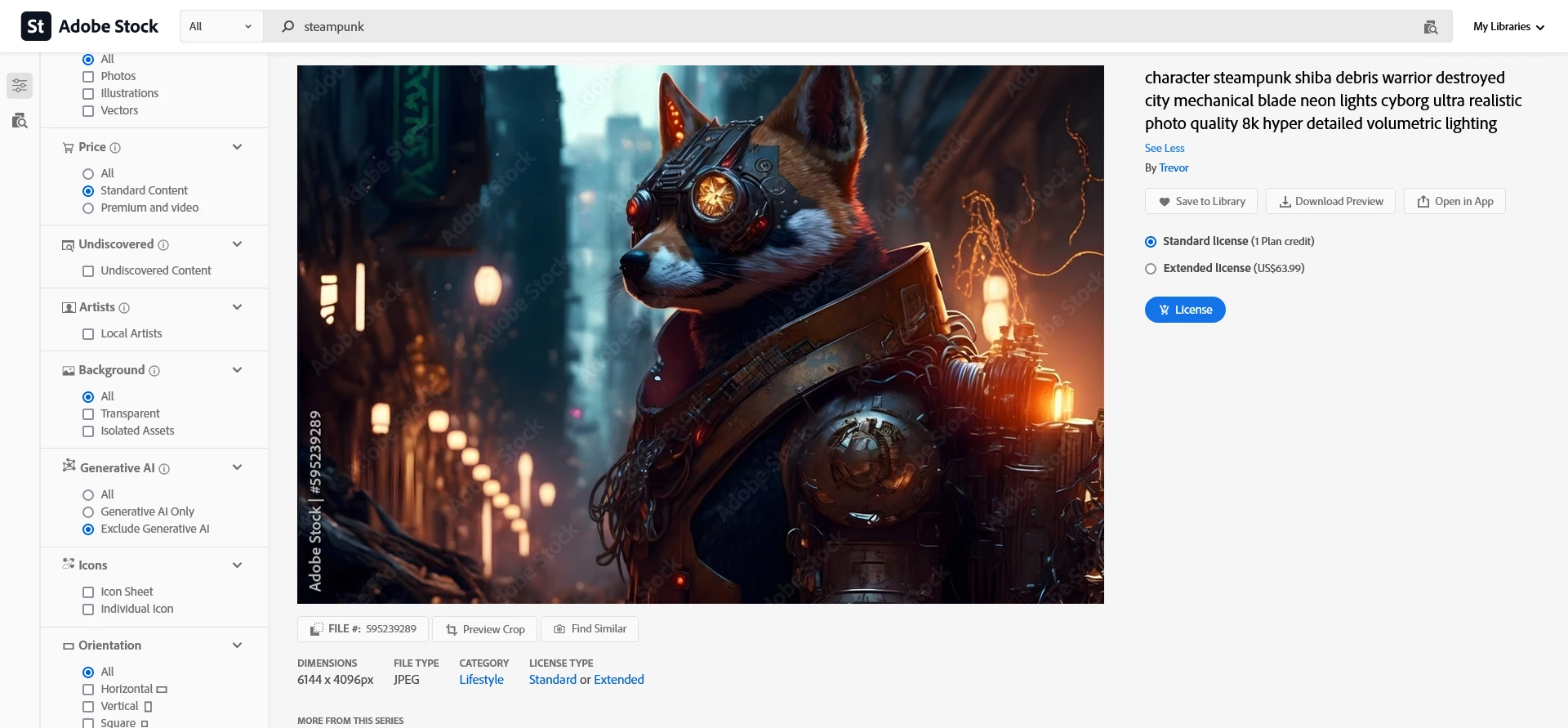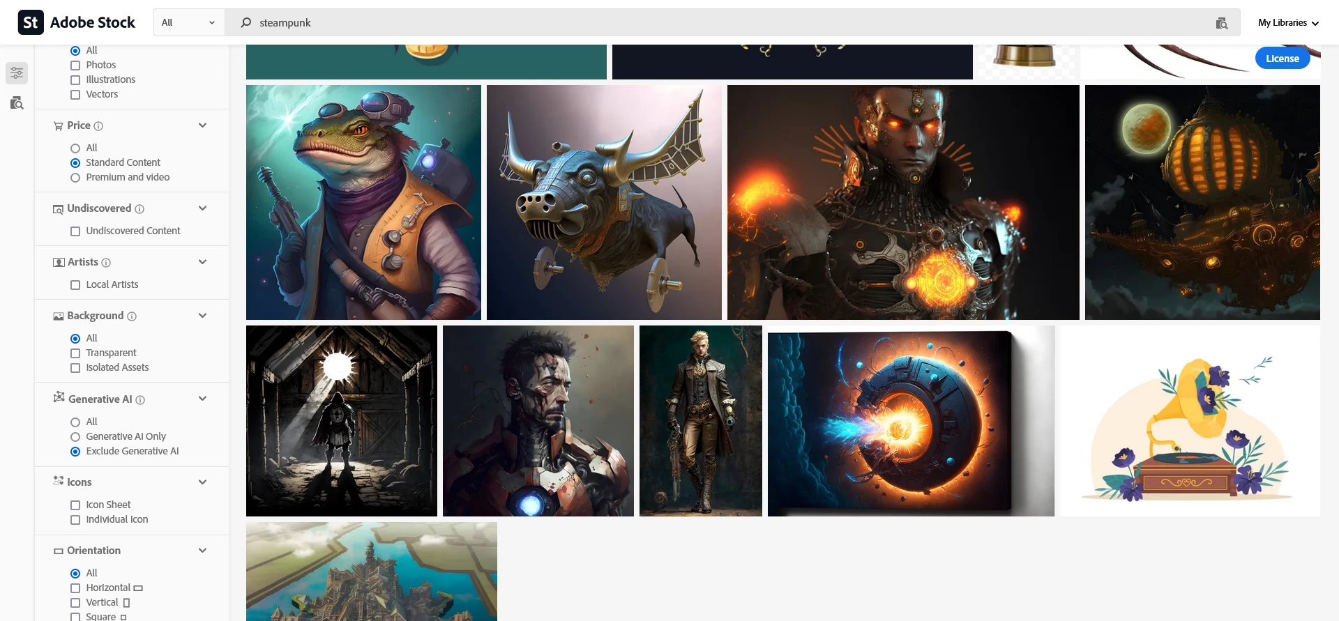 I've posted a couple of recent examples, using a search for steampunk imagery. Note that "Exclude Generative AI" is checked in both cases. In the second screenshot, the label is obviously a prompt used to generate the image. In the first, one of the images shows what appears to be a steampunked version of Robert Downey Jr.'s Iron Man character. The IP lawyers for Downey and Marvel Studios would have a field day if an Adobe Stock customer tried to use that image.