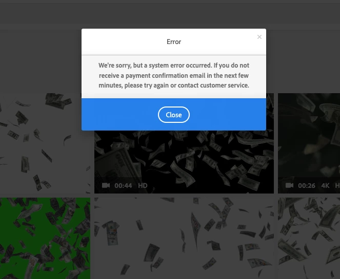 I have an Adobe Stock 25 Credits a Month plan and I'm supposed to get 3 HD videos a month along with it. However, Downloading videos is not functioning. I'm running a Macbook Pro 2019, 16-in, OS 12.4, and it doesn't matter whether i use Chrome or Safari. I've done all the troubleshooting - empty cache, delete cookies, history, etc. logged out and back in. Clicking a video does not give me an option to chose credits to license, and if I try to clike "BUY" i get the same error (see attached pic). Adobe customer care has been useless over the past 72 hours. Anyone else having this issue or have a work-around? Thanks so much!