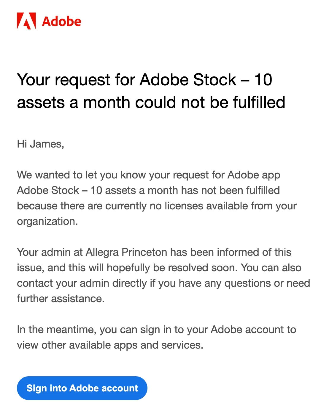 I asked that I get stock photos added to my plan at work and they decided to switch from individual plan to a larger team license. They have been trying to add stock for me, but have been unsuccessful. I thought I had it once, but then received the message "Your request for Adobe Stock – 10 assets a month could not be fulfilled" The Adobe person assigned to us is not getting back to us. It's been at least 3 weeks now. I have a screen shot attached of the email.