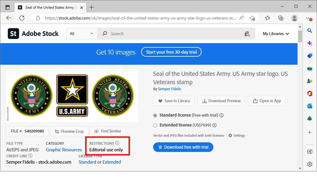 The file name seems to be correct. Please see this screen shot of Seal of the United States Army. US Army star logo. US Veterans stamp Stock Vector | Adobe Stock (if you do not see a screen shot please come back to the forum page Image License Question - Adobe Support Community - 13454903)
