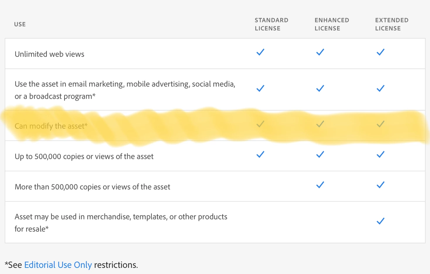 My first question: Can I edit the image as I wish? I would like to use the image for my business page, but I would like to make some changes before (move elements, change color etc.) Now I am not sure if this is possible with my standard license or if I need another license. I already found and looked at this page here https://stock.adobe.com/license-terms, but I can't figure it out.