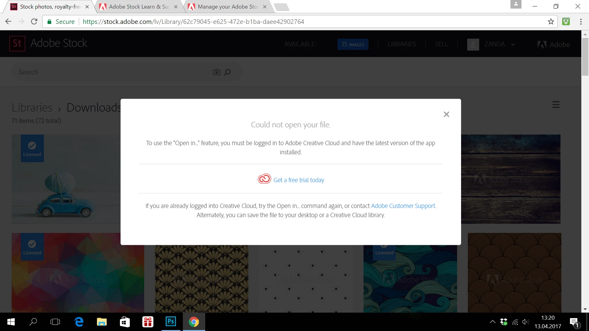 I bought a picture but it is not opening in Creative cloud photoshop. Membership is payed for this month.