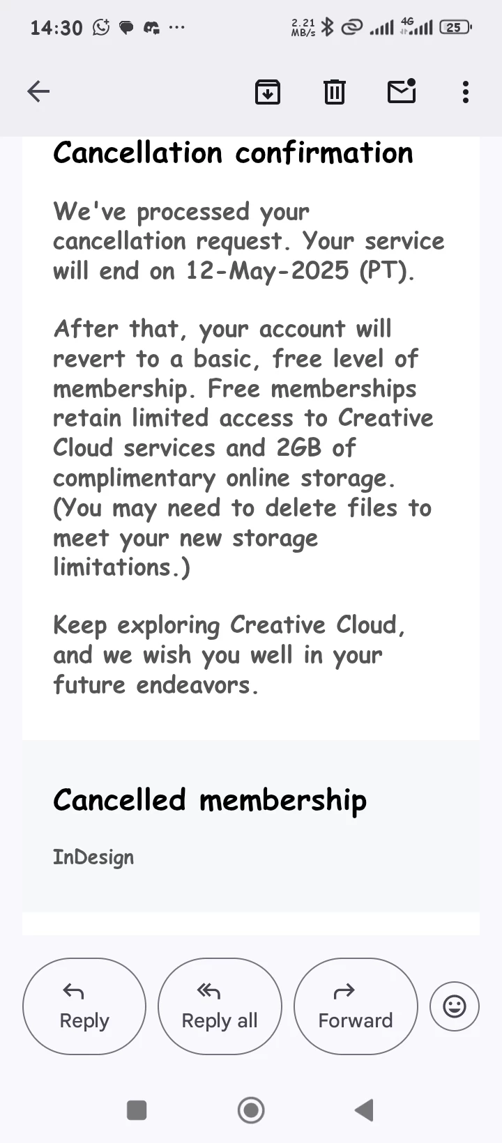 I tried to used adobe Indesign on the 12th May, 2025, but I find out that my system is not compatiable with the software. I immediately cancel my subscription about the app. Not knowning much about the cancellation process. A mail was sent to me on that same 12th of May, 2025, confirming my cancellation. To my greatest subsprise was charge today for a service I did not use. Please kindly help me refund my money.