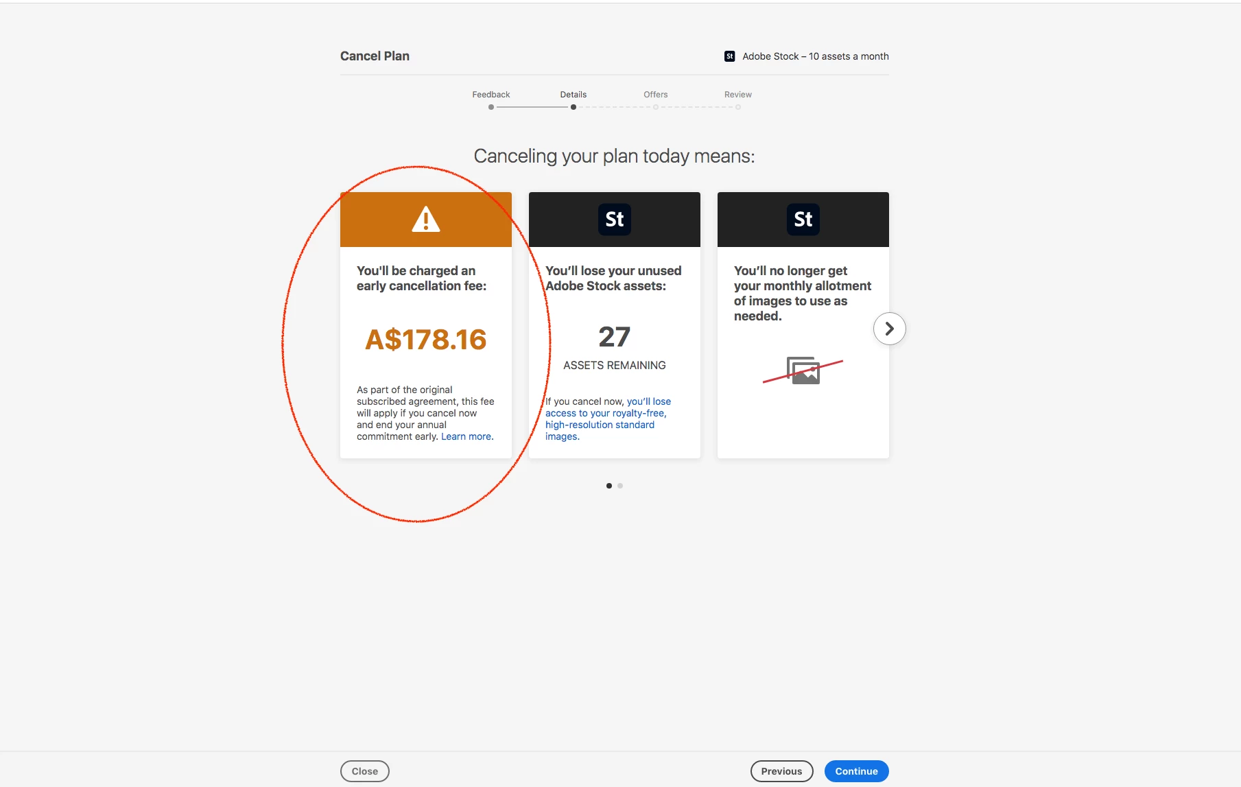 Like many others, I've been scammed by Adobe that will charge you a HUGE fee, when you don't want to pay the $39 for their 10 assets a month.