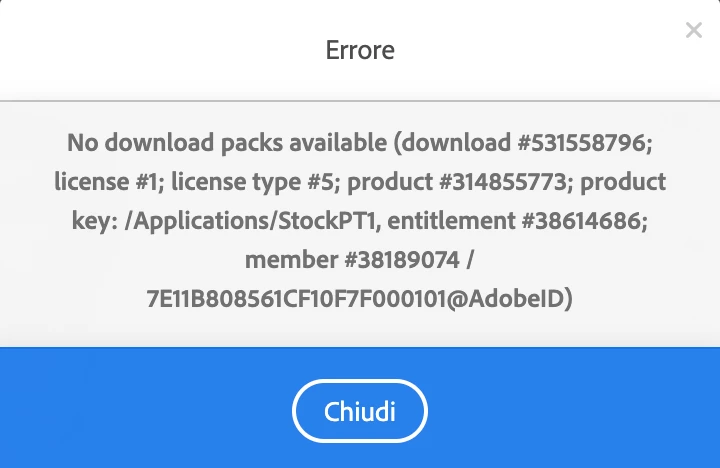 "No download packs available (Download#531558796; license #1; license type #5; product #314855773; product key: / Applications/stockPT1, entitlement #38614686; member #38189074 ecc."