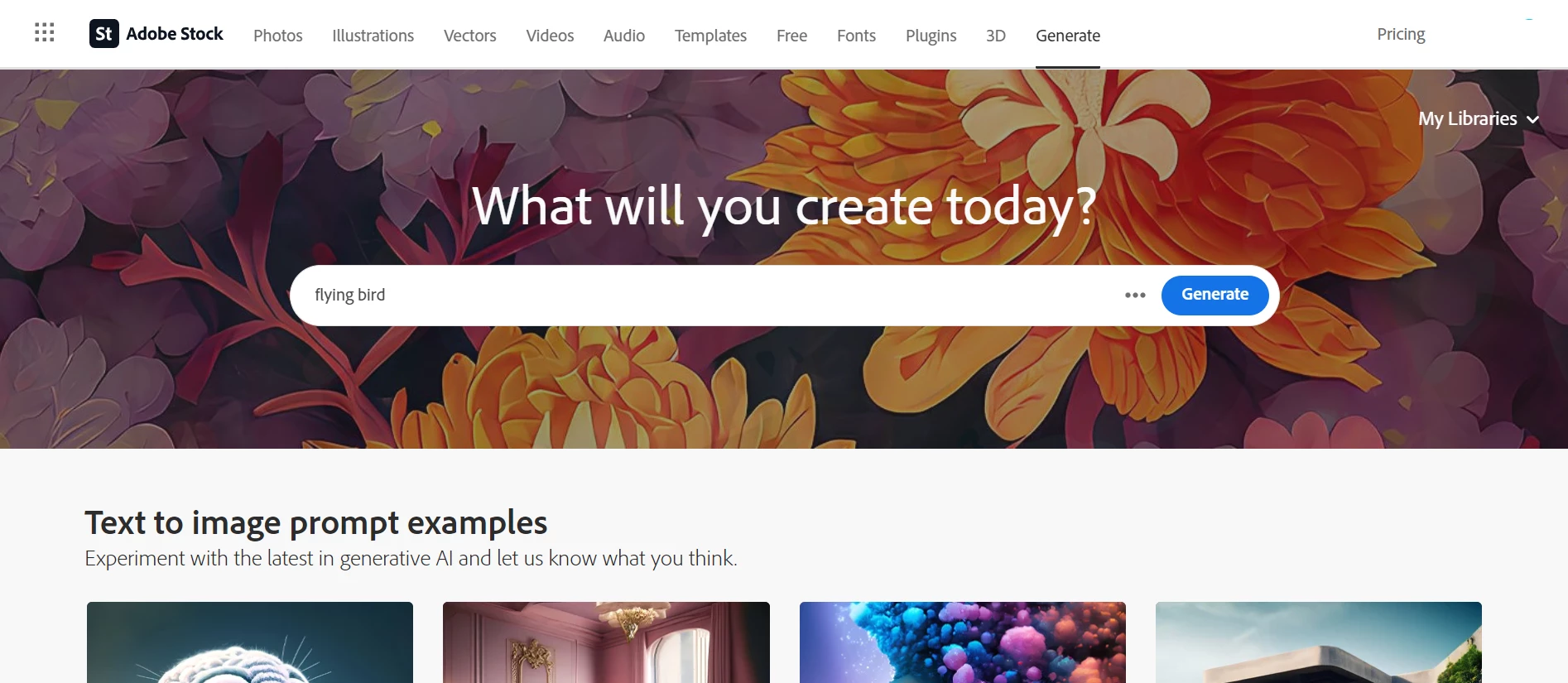 In the search bar, type in a description of the image you want to create and then click on the generate button, as shown below: