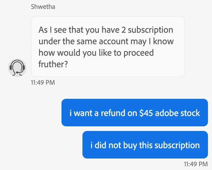 I was charged $45 for Adobe Stock which I didn't even buy and customer support completely shut off my inquiry.