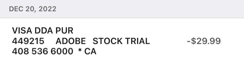 Hi I need your help , I check my acount and I see 29.99 doller for Adobe stock trial cought from me . I cant't understand that. I even dont have it and dont using it . I might one time click on it to know what it is but I have not using that . please let me know can I get this money back and what should I do to not seeing such this things happen to my acount .