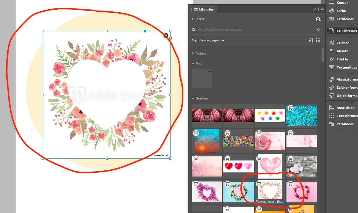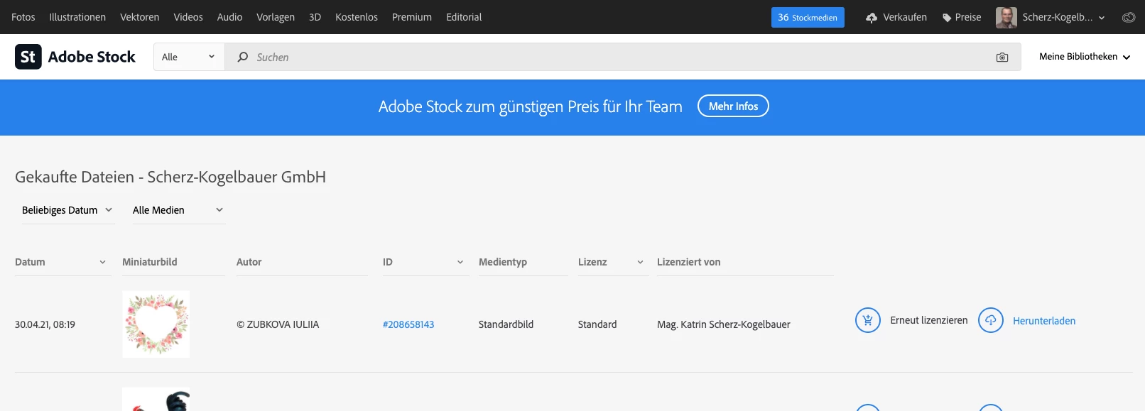 Nun passiert aber nichts, wie sonst üblich. Das Bild bleibt als Layoutbild bestehen, auch im Fenster "CC Libraries" bleibt alles unverändert. Lediglich wenn ich online auf unseren Account gehe und mir den Lizenzverlauf ansehe, dann sehe ich dass das Bild lizenziert wurde.