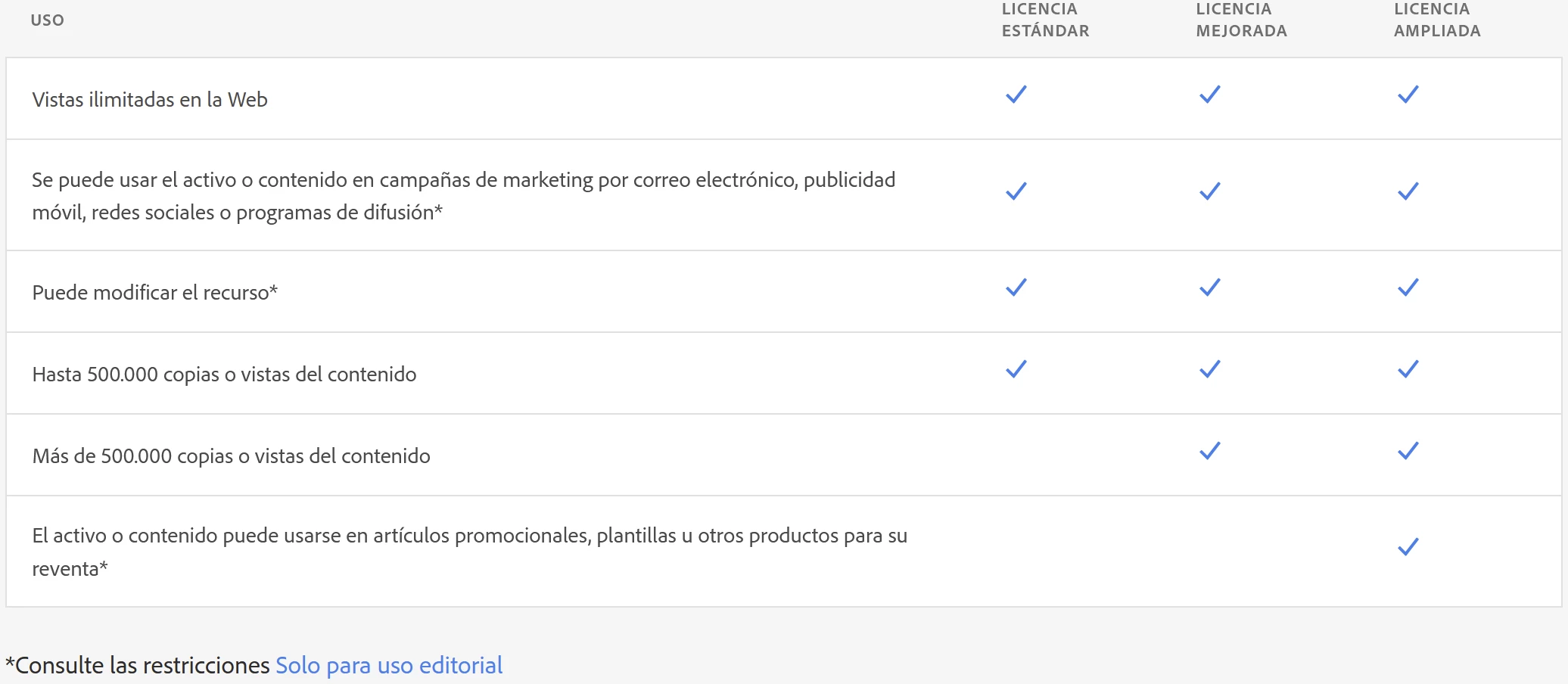 ¿Qué licencia necesito para utilizar las fotografías de Adobe Stock en fotomontajes para clientes que después las utilizarán en carteles de eventos, portadas de libros o acompañar el artículo de una revista? Tengo la duda porque estoy buscando un banco de imágenes para empezar a trabajar de diseñadora gráfica y veo que Adobe Stock tiene una licencia estándar, una mejorada y otra ampliada, pero no entiendo todas las diferencias entre las licencias (aun habiendo leído la página de Información de licencias de Adobe Stock) y no sé qué licencia necesitaría para el uso que le voy a dar a las imágenes que compre. Mi intención sería crear nuevas imágenes fusionando varias fotografías, no utilizar directamente las que descargara, sin modificar, para venderlas tal cual aplicadas a productos como tazos o camisetas.
