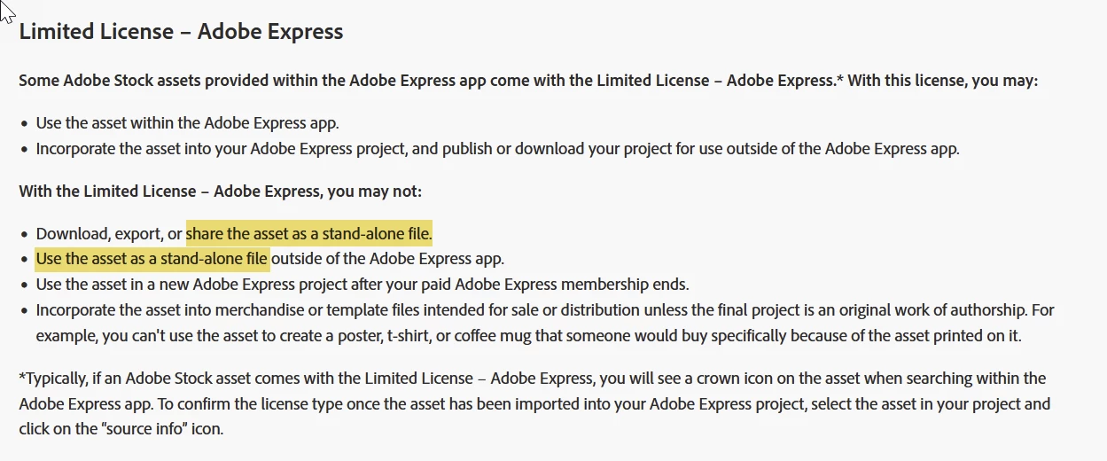 Hi, I need help with understanding the rules and limitations associated with the standard license for Adobe Stock and Adobe Express images. I've read the terms and conditions, but I'm still unsure about some points. I have a few questions: