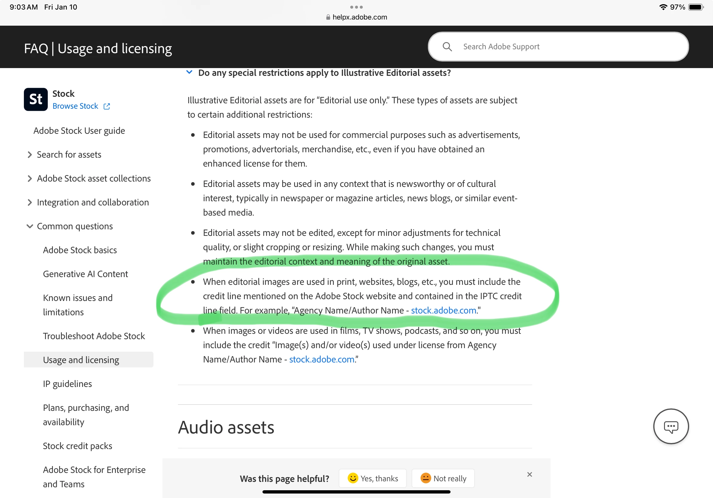 When using stock.adobe.com/free resources for editorial purposes, do I have to sign the photos with the author and that they were downloaded from adobe stock?