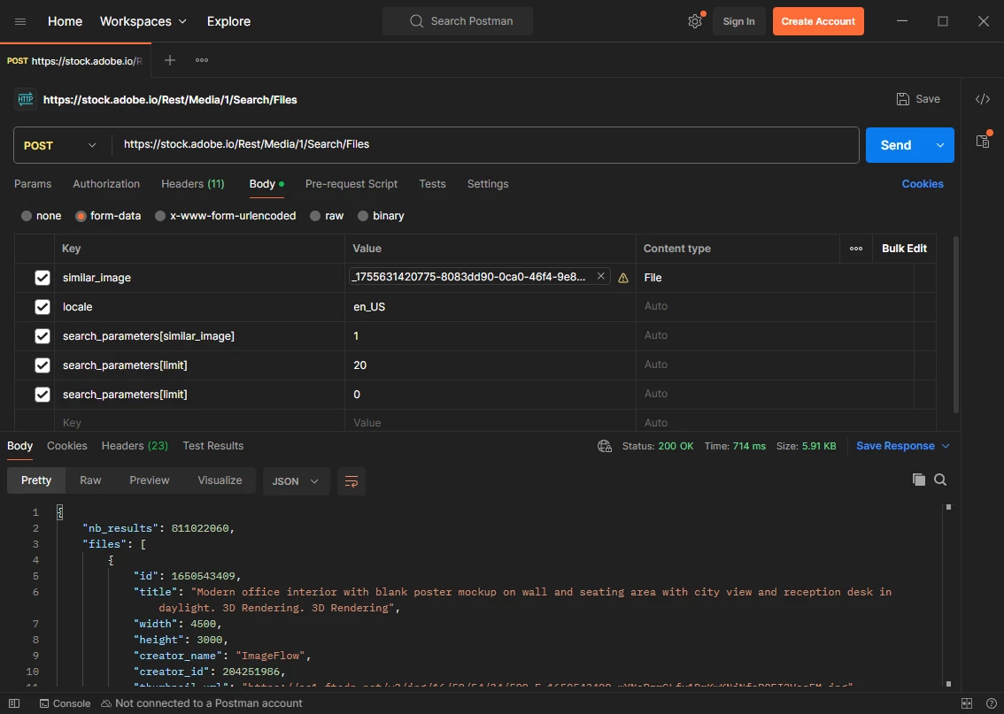 I'm sending a POST request to /Rest/Media/1/Search/Files with similar_image (multipart file upload) and search_parameters[similar_image]=1.