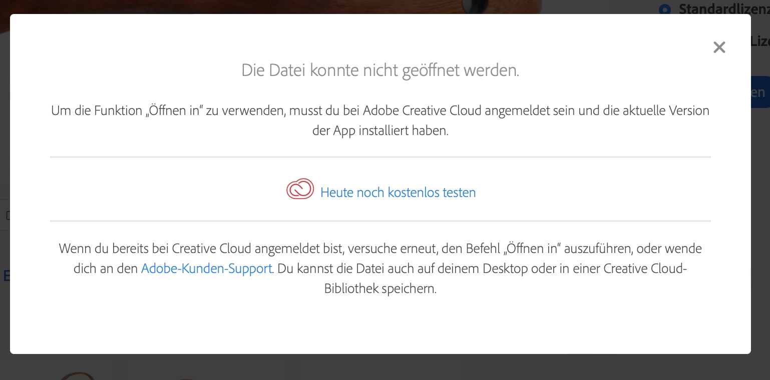 HHeino PetersParticipantForum|Forum|3 years agoNovember 2, 2022QuestionStock-Foto „Öffnen in“ verweigertForum|Forum|3 years agoNovember 2, 20221 reply104 viewsobwohl angemeldet, wird Öffnen in verweigert, mit dem Hinweis, dass ich in der CC nicht angemeldet bin although logged in, Open in... is refused with the message that I am not logged in to the CC. [moderator deleted unrelated data]Account managementTroubleshootingCreative Cloud Integration