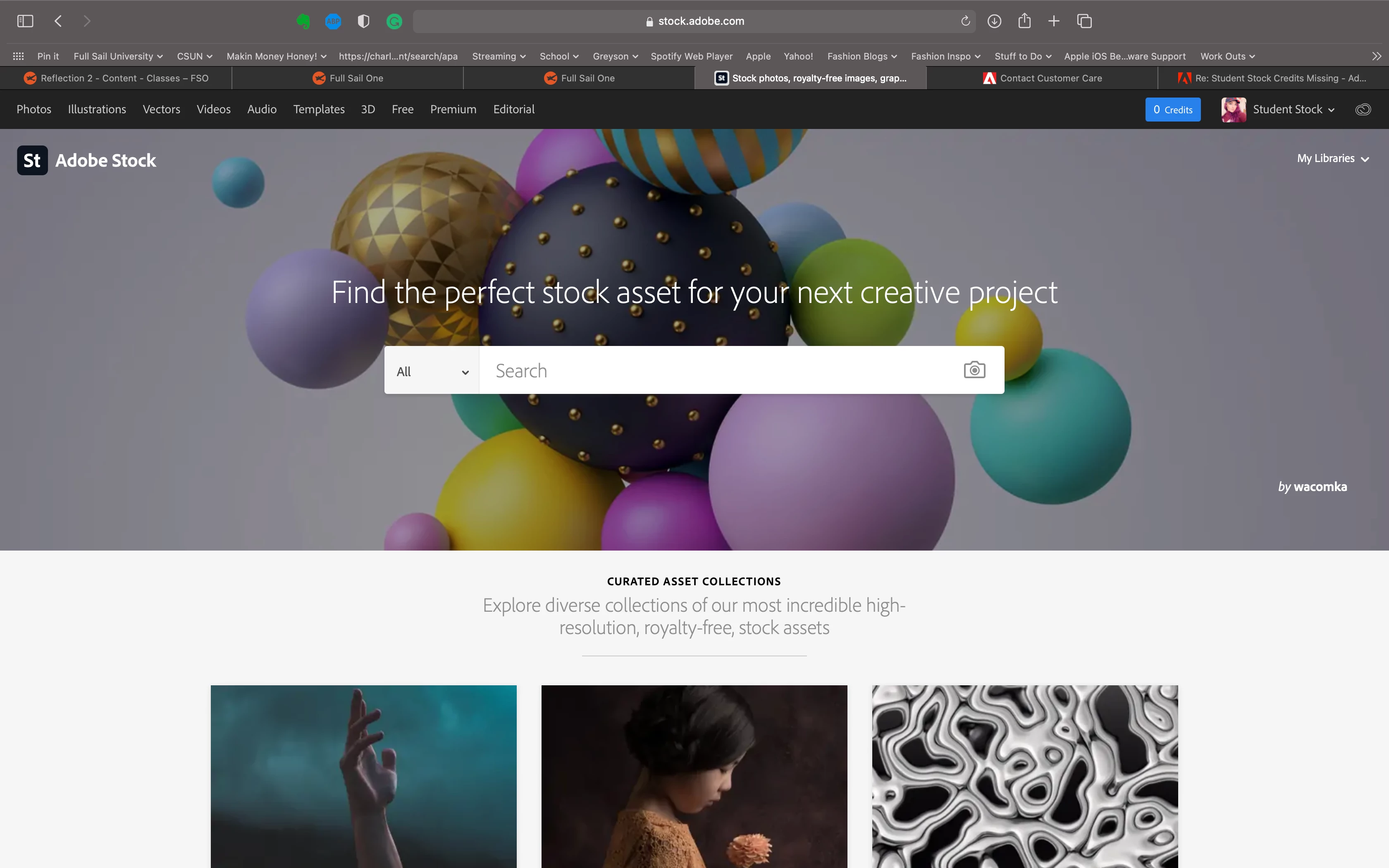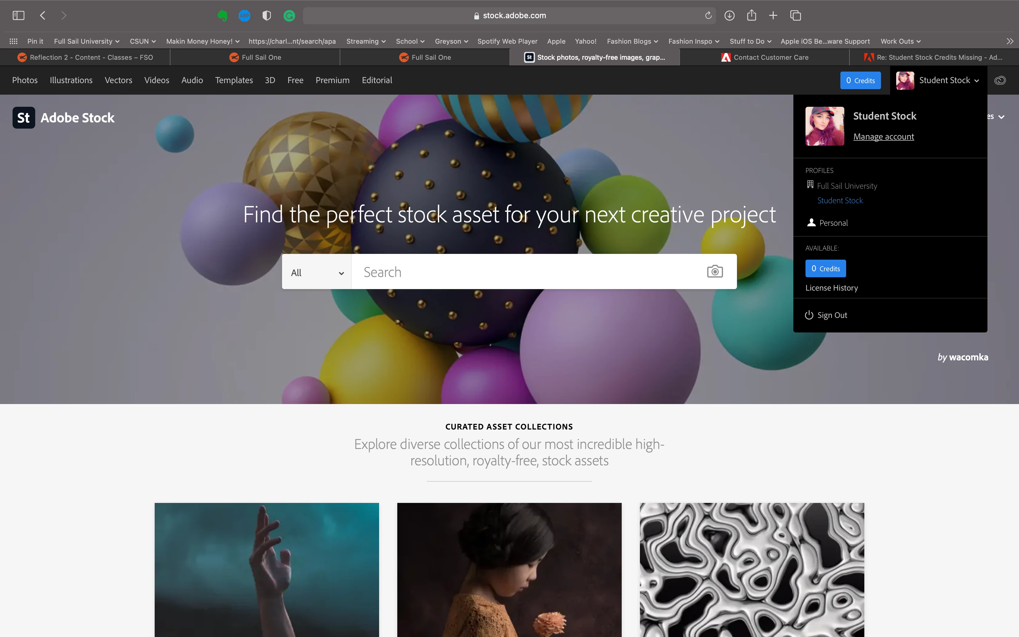 Anyone else having the issue of having 0 student stock credits available? I tried going through my school's tech support but they were no help, and I'm not able to chat with an Abobe rep because they tell me I need to speak to my school's tech support! Gah so frustrating! I literally am not able to license anything-not even the free stock content. Help 😞