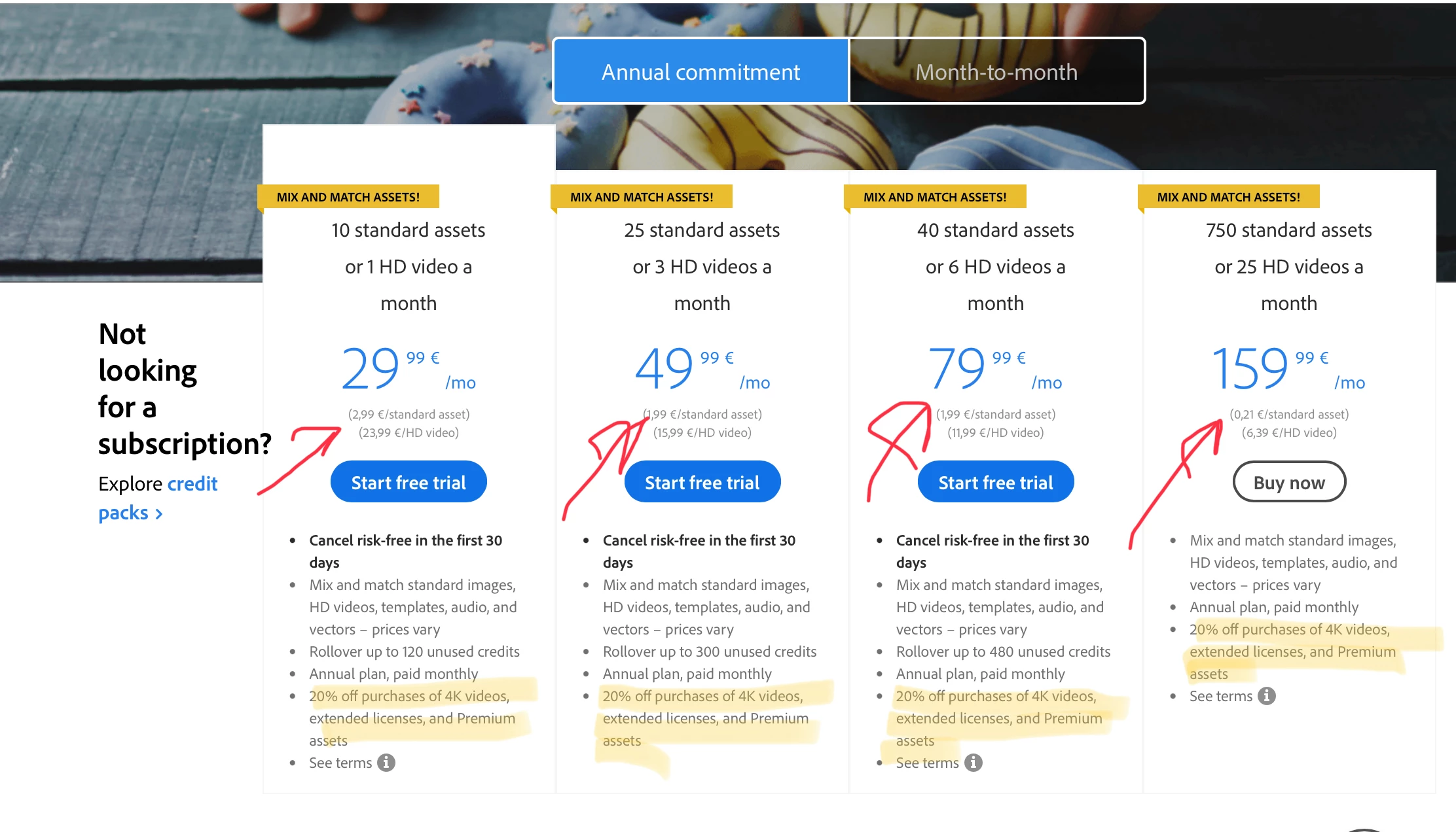 That's normal. 750 credits/month does only mean, you get 750 standard licences. as for other assets, other prices apply, and they get translated into credits. If you check the conditions, you'll see, that you get a 20% off the standard price for extended licences or 4k videos. But the value of a credit is less with a 750 assets per month, compared to a 40 assets/months subscription. Ergo: you need more credits.