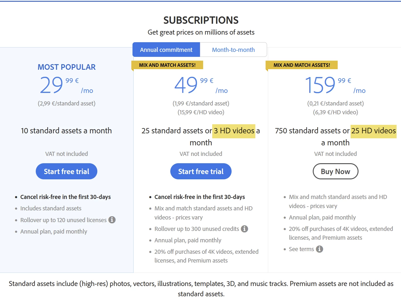 is found near seemingly contradictory phrasing like "Standard assets include millions of royalty-free images, illustrations, music tracks, motion graphics, design templates, and more," where video is excluded. There seem to be on the one hand claims that video can be licensed by having a subscription plan, but it's not clear that any plan comes with a certain amount of credits; only "assets" are quantified. Furthering the confusion, no video seems to be available for credits at all. Each video shows a specific dollar amount for license.