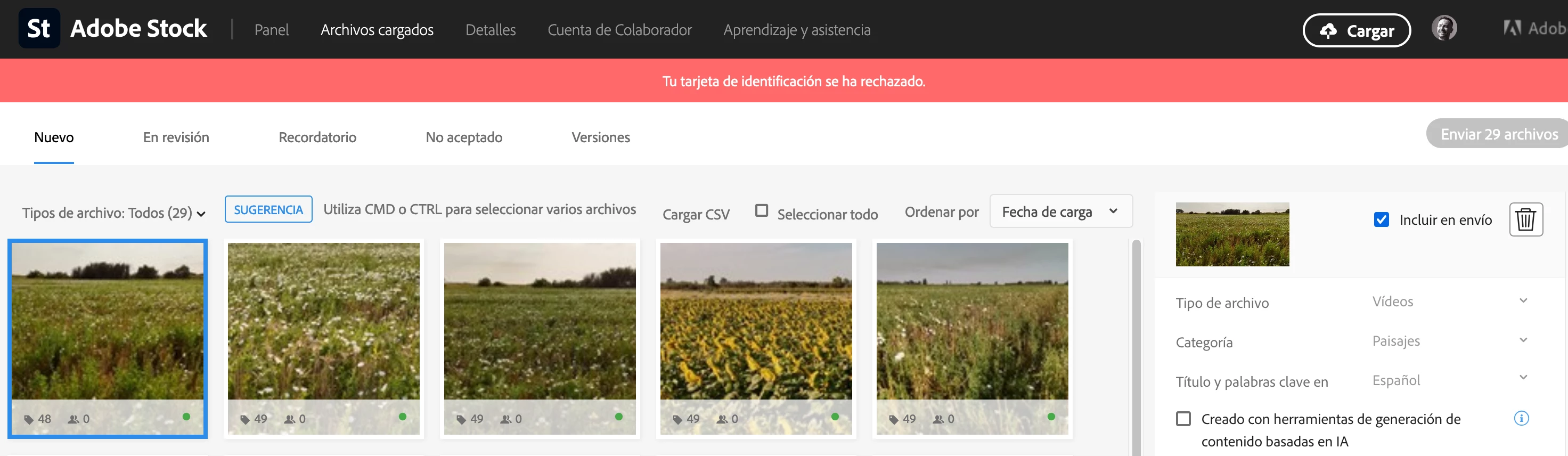 una vez que cargo los videos en Adobe Stock para vender, no me da la opción de poder enviarlos. Alguien sabe por que?. y me salta este cartel arriba que dice "Tu tarjeta de identificación se ha rechazado".