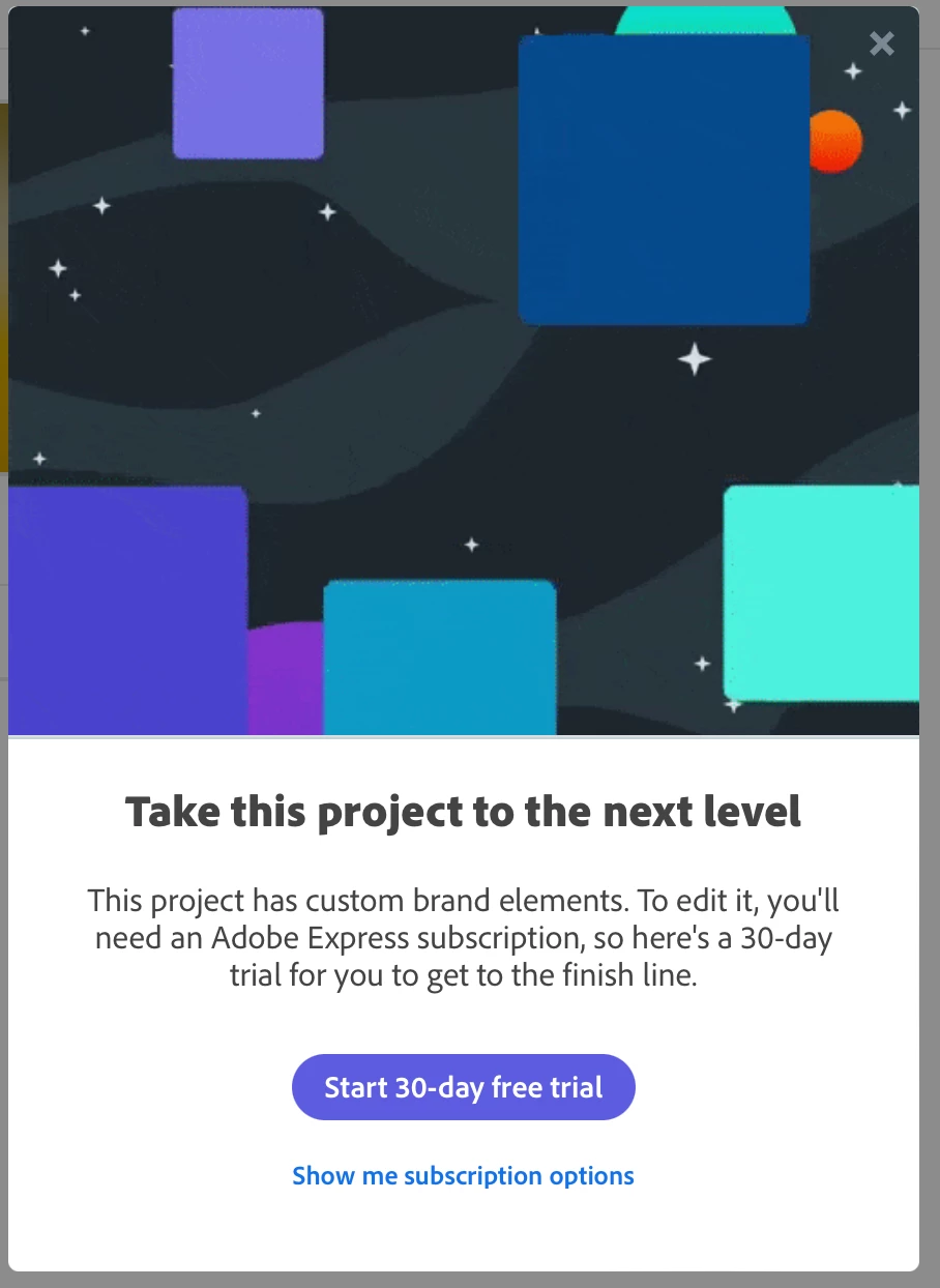"This project has custom brand elements. To edit it, you'll need an Adobe Express subscription, so here's a 30-day trial for you to get to the finish line."