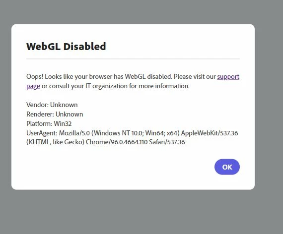 Adobe Creative Cloud Express - WebGL Disabled Error dialog box