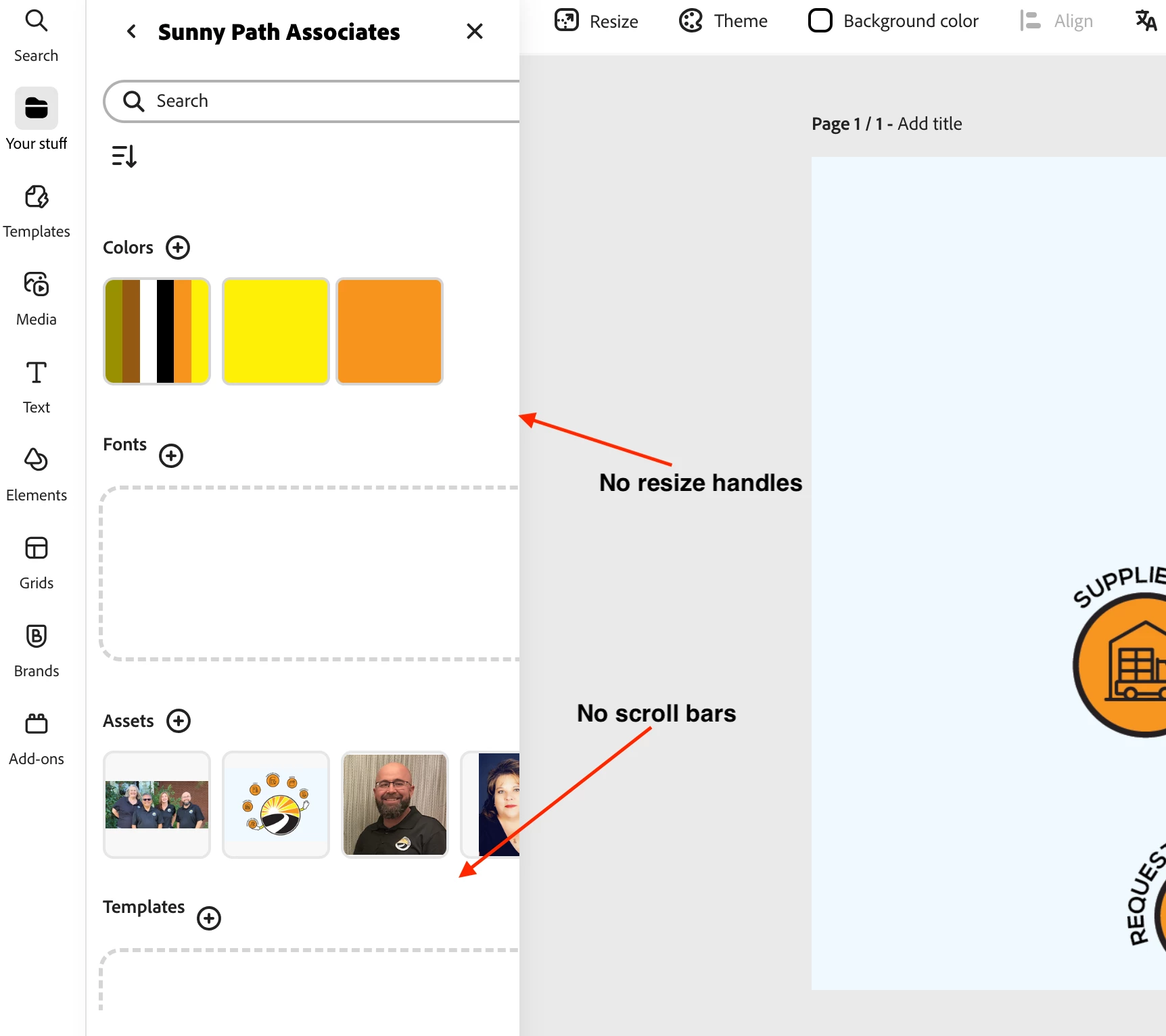 Is there a setting somewhere that I'm missing? Resizing the window doesn't work and the columns on the page seem fixed, so I can't even resize the frame. I'm using Adobe Express Web on Chrome for MacOS.