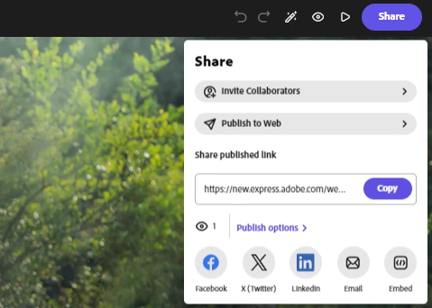 The Webpage Views is now available in Adobe Express. It is accessible from the 'Share' menu in the webpage editor.