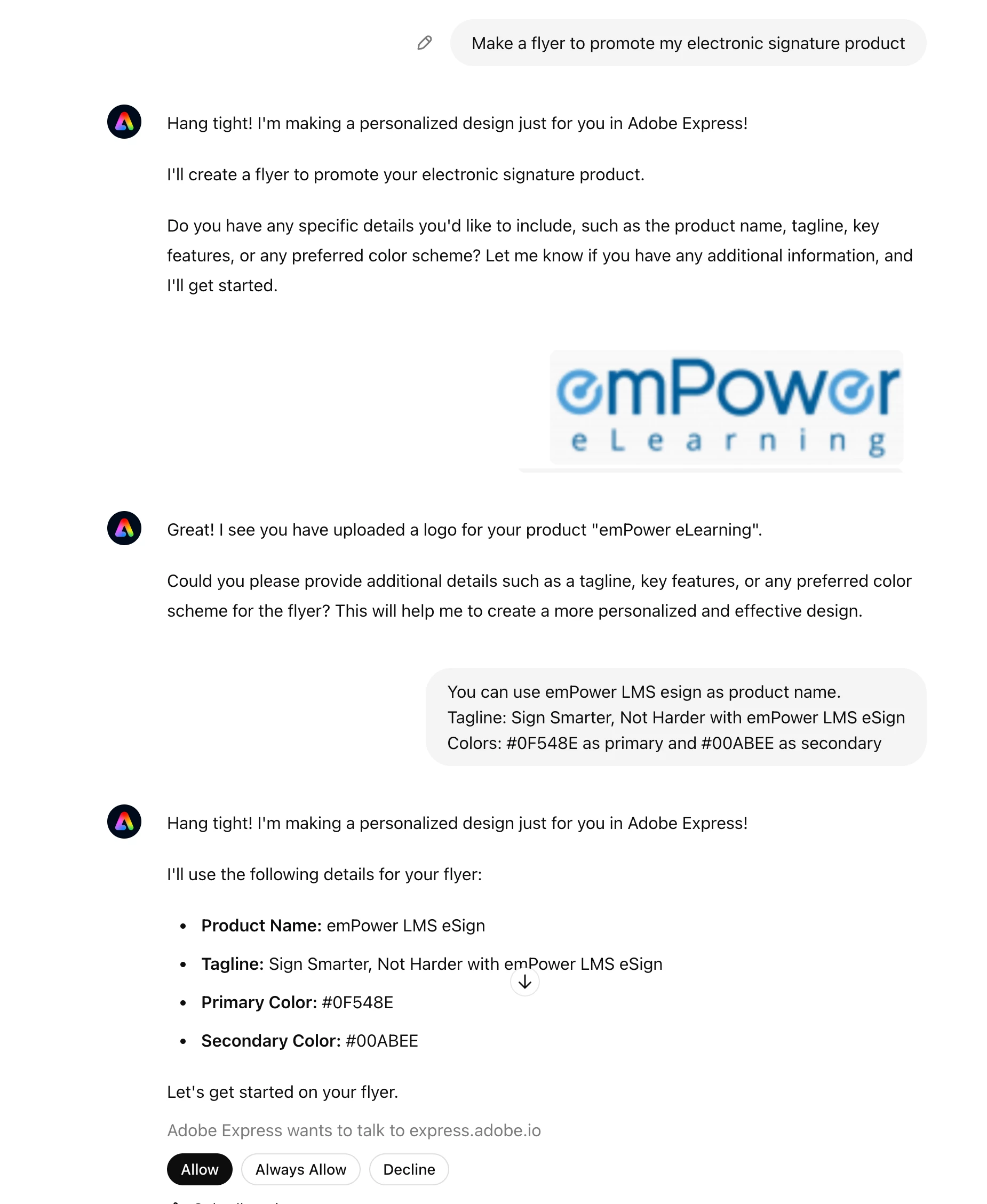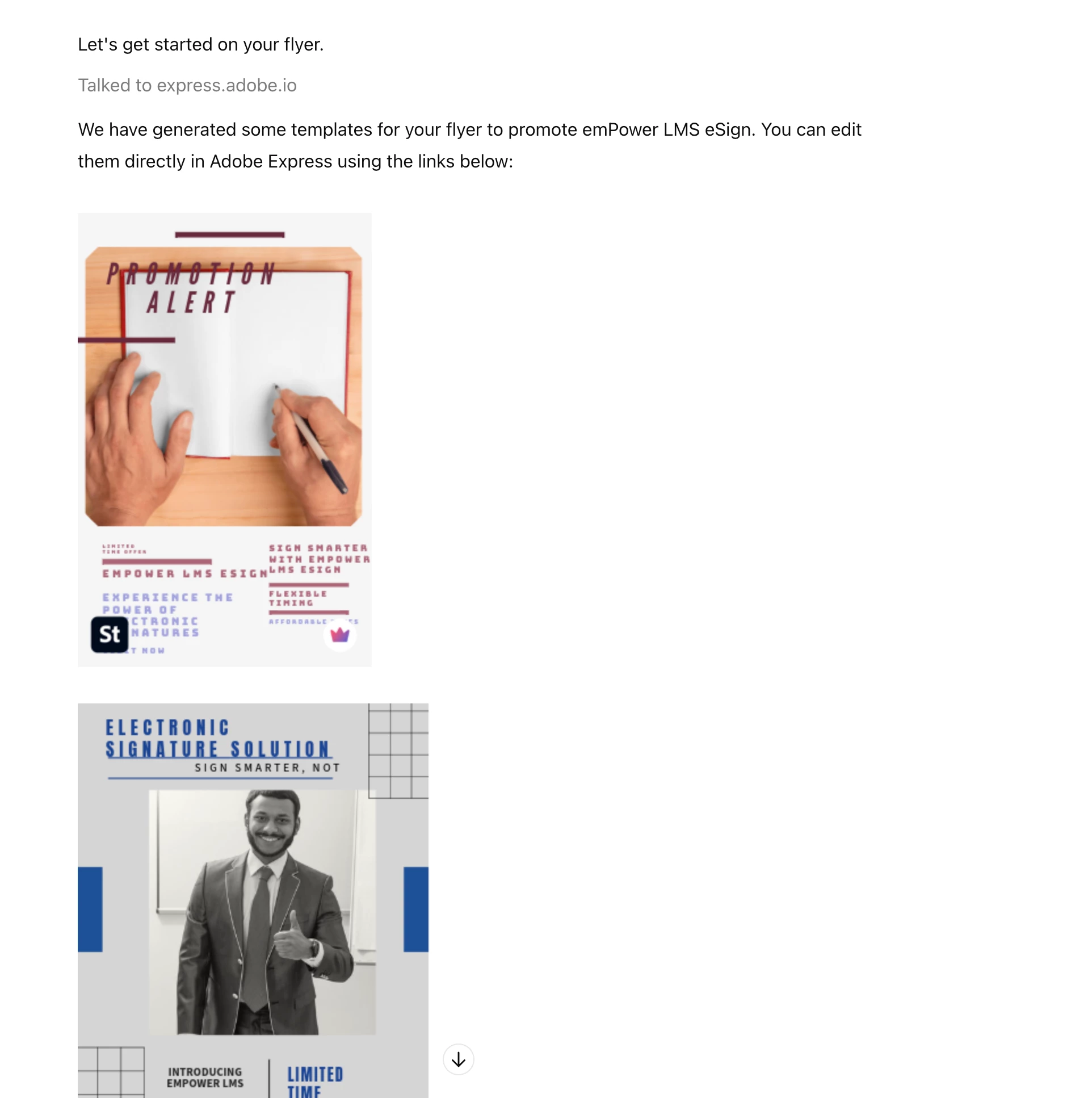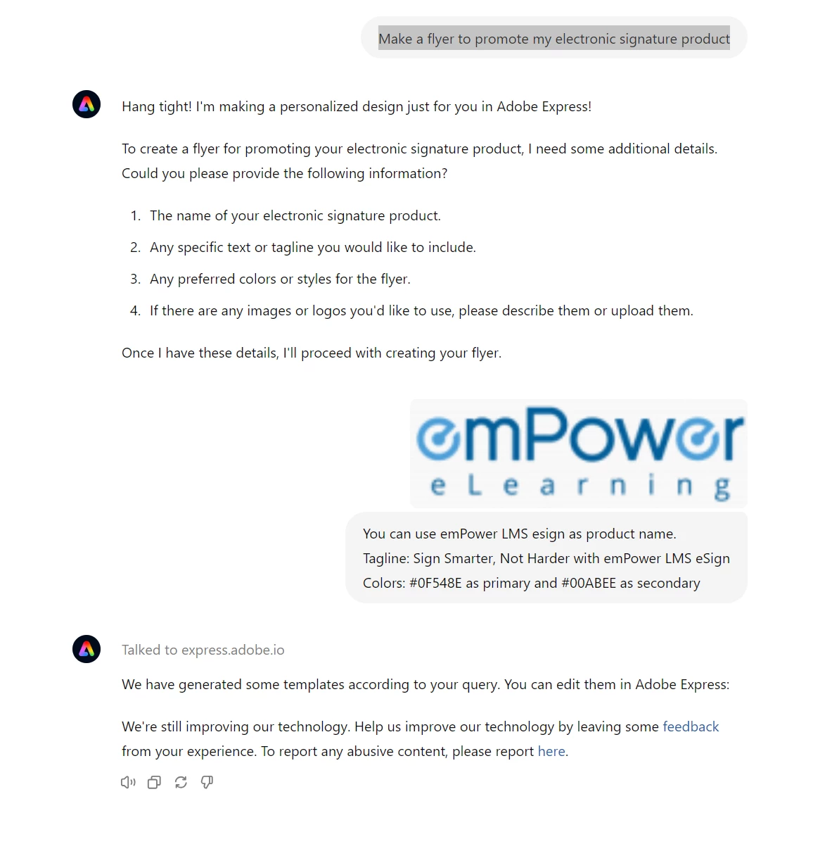 Adobe Express with Chat GPT shows worst designs esp. regarding Logo. and neither it loads template on new Tab when we select a theme to check. The effort is good from your team, but please try it yourself first before testing public users. it wastes precious time for graphic designers. Also add an option for Ui Ux design. Will be looking forward to your response.