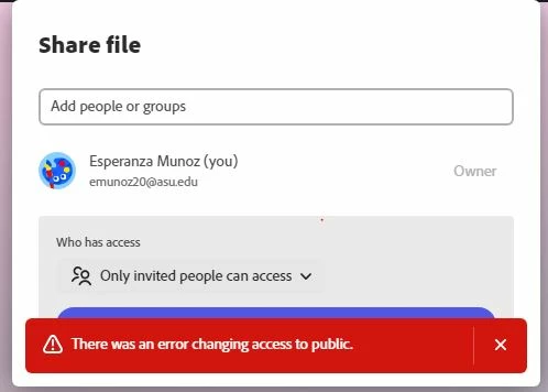 I am attempting to make a webpage portfolio for a class I'm taking. My teacher wants us to change the share link access to "anyone with a link" and "can comment". Every time I attempt to do this the following error message pops up: