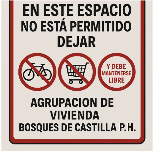 Por favor hacer una imagen con el siguiente texto: En este espacio no está permitido dejar bicicletas, carros de mercado, y debe mantenerse libre. Debe ir firmado por AGRUPACION DE VIVIENDA BOSQUES DE CASTILLA P.H. Y lo mismo le pides a Chat GPT y vean la diferencia. A quien se le puede reportar estos errores?