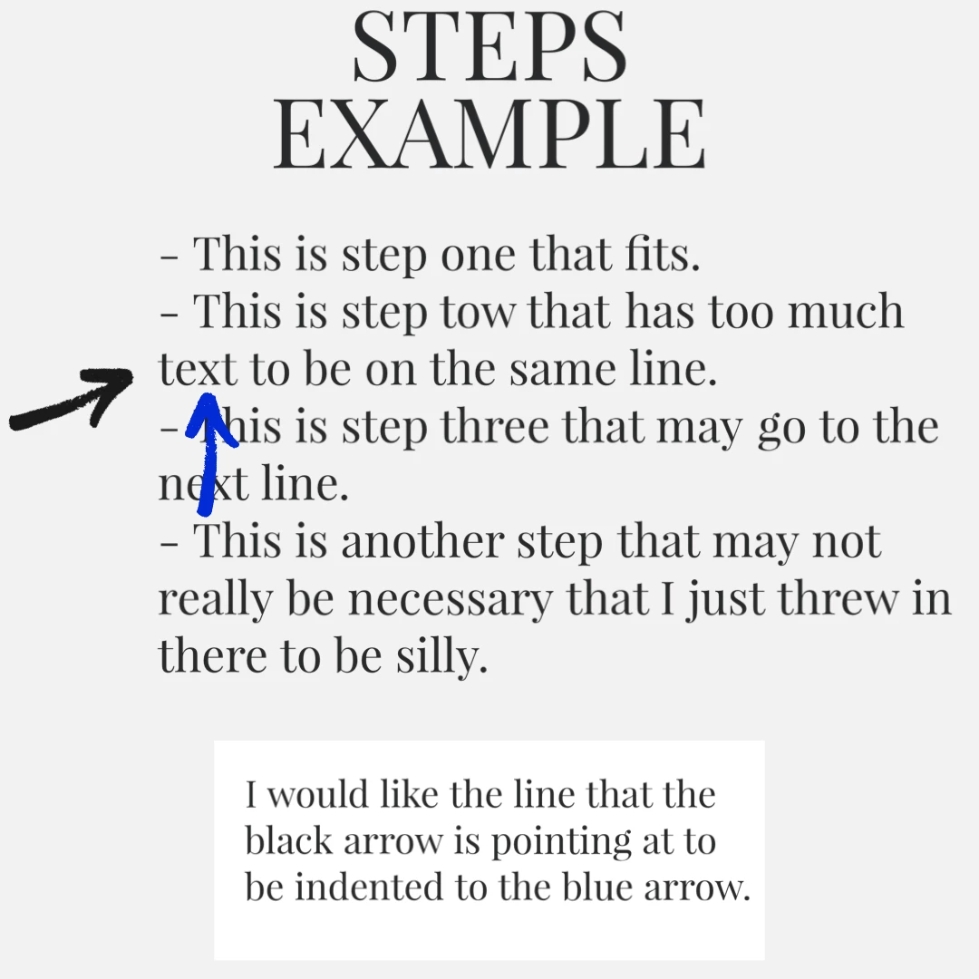 I have some text in step by step type of format. The "steps" extend to a second line in some cases. I ma using a basic dash as a "bullet" for the steps. I need the text on the second line to be indented past the bullet and line up wit hthe first letter of the beginning of the line. I hope this makes sense. I included an image of what I am trying to do to help explain.