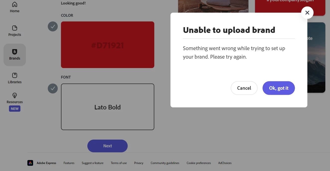 However, when I click on "Brands" in the left menu in the last screenshot I can see all my brands and edit them. In the old projects I created a few days ago and before I can still use my brands as usual. Does anyone know how to fix this bug or report it? I considered using the Bug report form at https://www.adobe.com/products/wishform.html, but Adobe Express is not on the product list there.