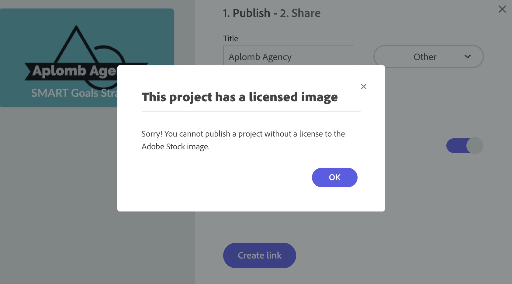 I am still getting this message. I logged out and logged back in and it will not let me publish my video. I haven't used any adobe stock images either 😞