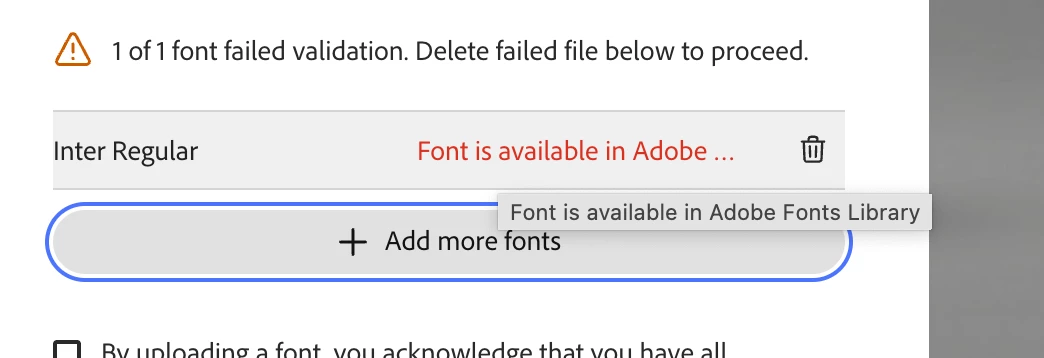 However I can’t find a font that belongs to my Adobe Fonts Library, and when I try to upload it as a file it says the font belongs to the library but when I search it up I can’t find it anywhere.