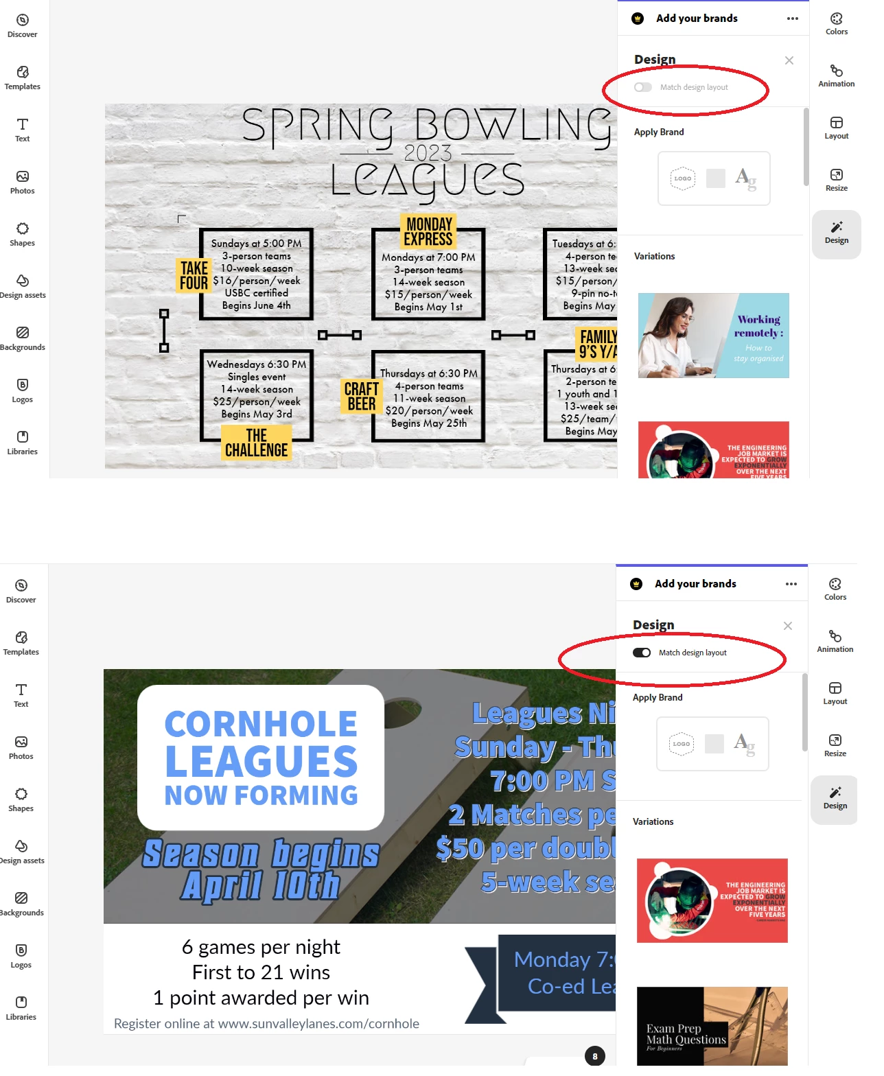 Now when I chose a pre-built design, my project doesn't change to match that design. I noticed that there is a toggle at the top of the design section that says "Match Design Layout" and it is toggled off. I assume if that was toggled on, then it would behave the way I want it to. However, it's not possible for me to toggle it on as it is grayed-out.