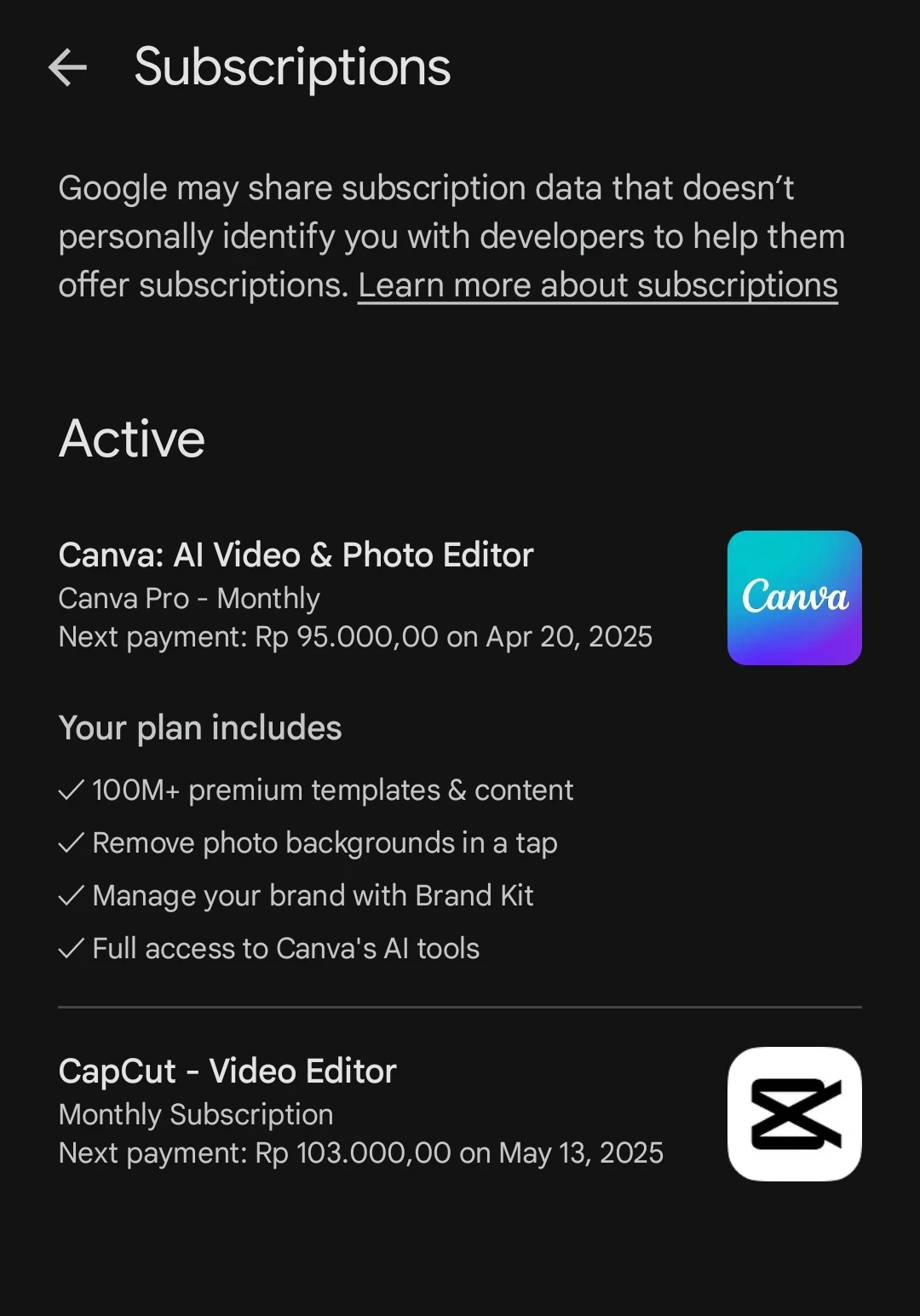 How to cancel my active subscription immediately? I purchased it by Google play system, but there is no my adobe express subscription there, I attached the capture subscription list.