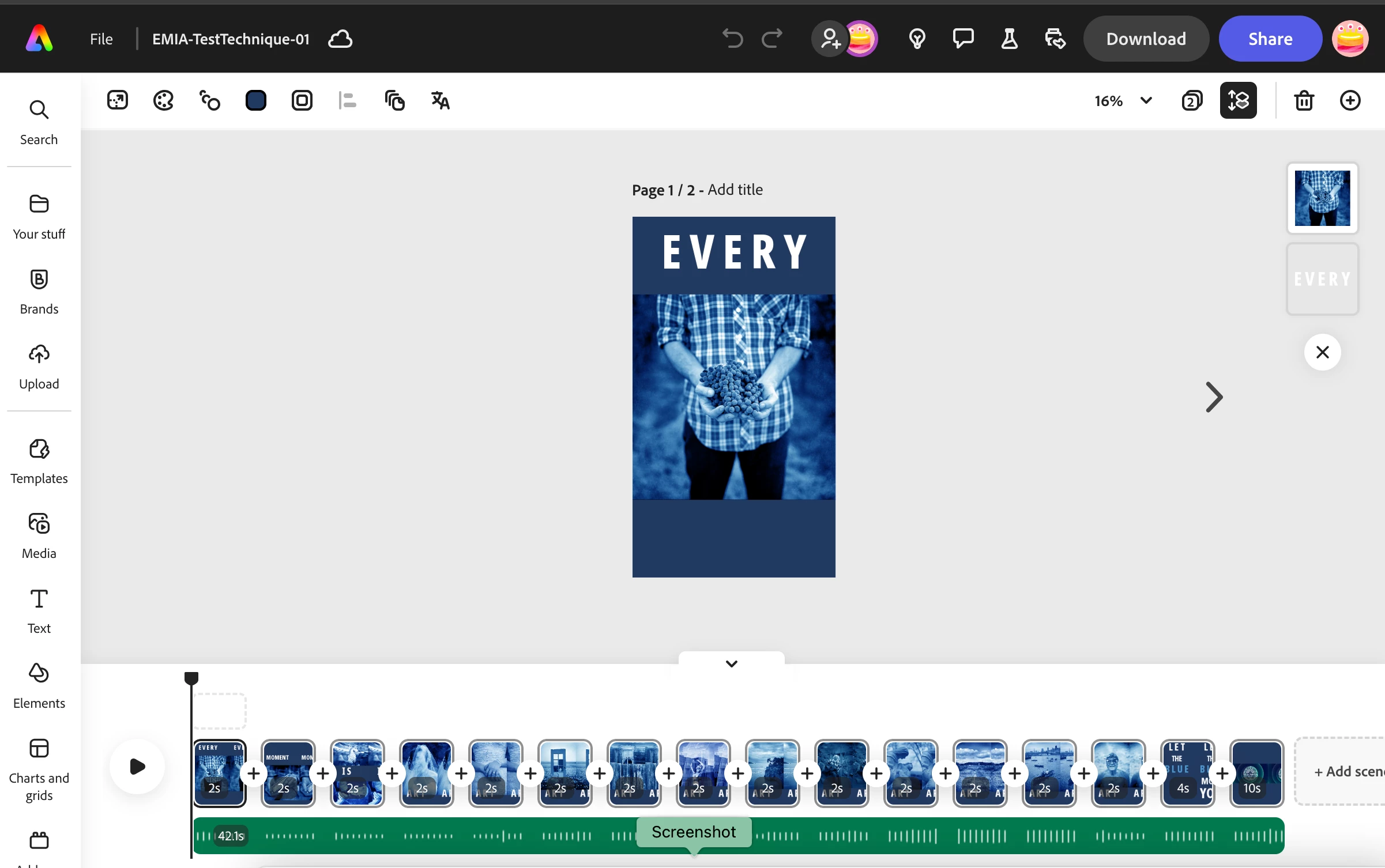 Either way, I used photos, text, a background and animation to create 16 different "scenes" ("pages"?) using layers, but Adobe Express won't Download or Export them all together. I have seen references to "merge all scenes", but I've never seen a button or command to do that. This is a VERY VERY confusing app!