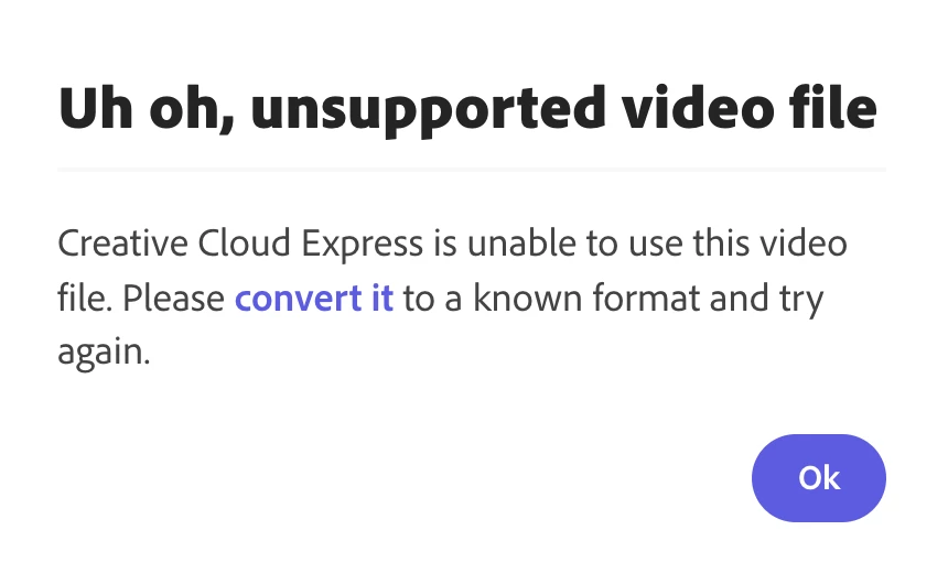 I'm trying to upload a video from my hard drive to the video generator in Creative Cloud Express (previously Adobe Spark Video) and I keep getting told that it's san unsupported file type even though it's an mp4.  I tried uploading it using https://express.adobe.com/tools/convert-to-mp4, converting it, downloading it to my hard-drive and re-uploading it to creative cloud express, but that didn't work either.  Any suggestions on what I should do?