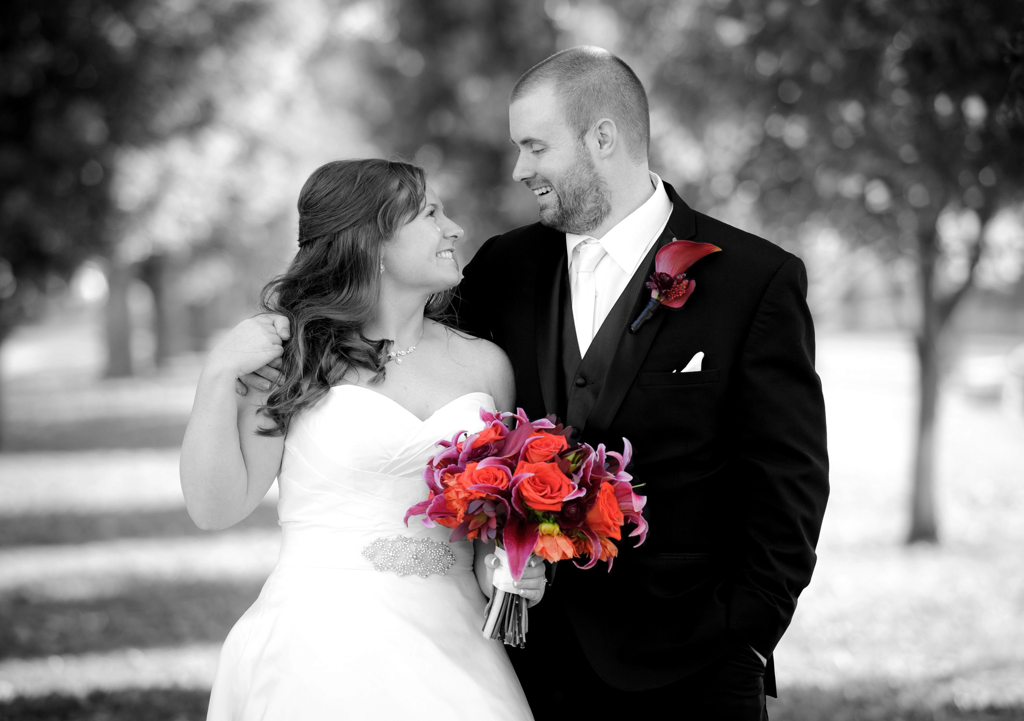 Example, B&W filter is added to photo, an area on some red roses is where the B&W is removed