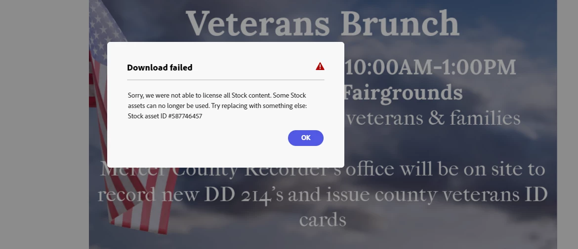 There may be another asset that isn't your background that has been removed from Adobe Stock. You can check by clicking on the various image layers, and then in the image panel on the left click the little i icon for the information panel. If that Stock Asset ID# matches the #587746457 from the messages you are seeing, then you'll need to find a replacement asset to use.