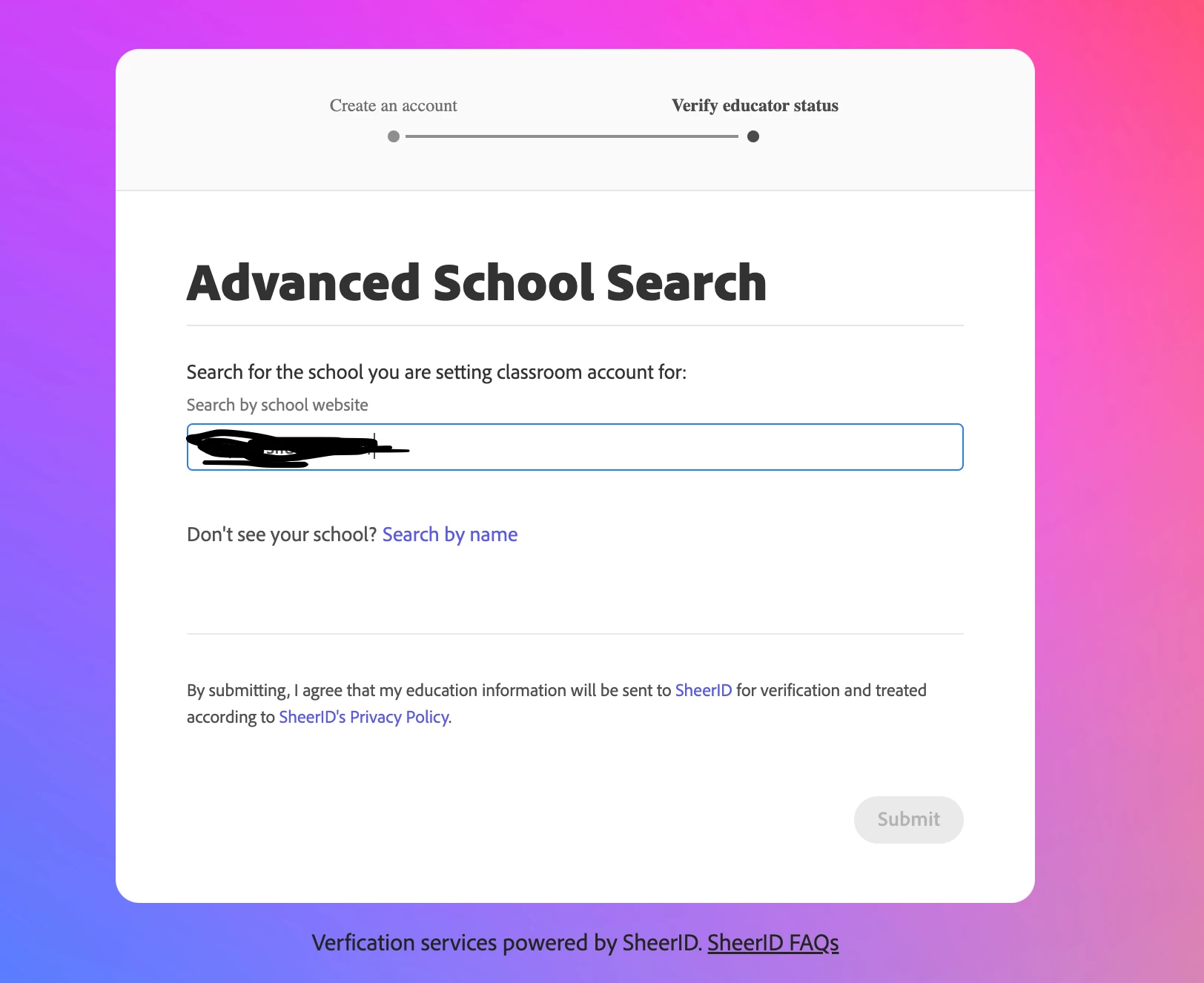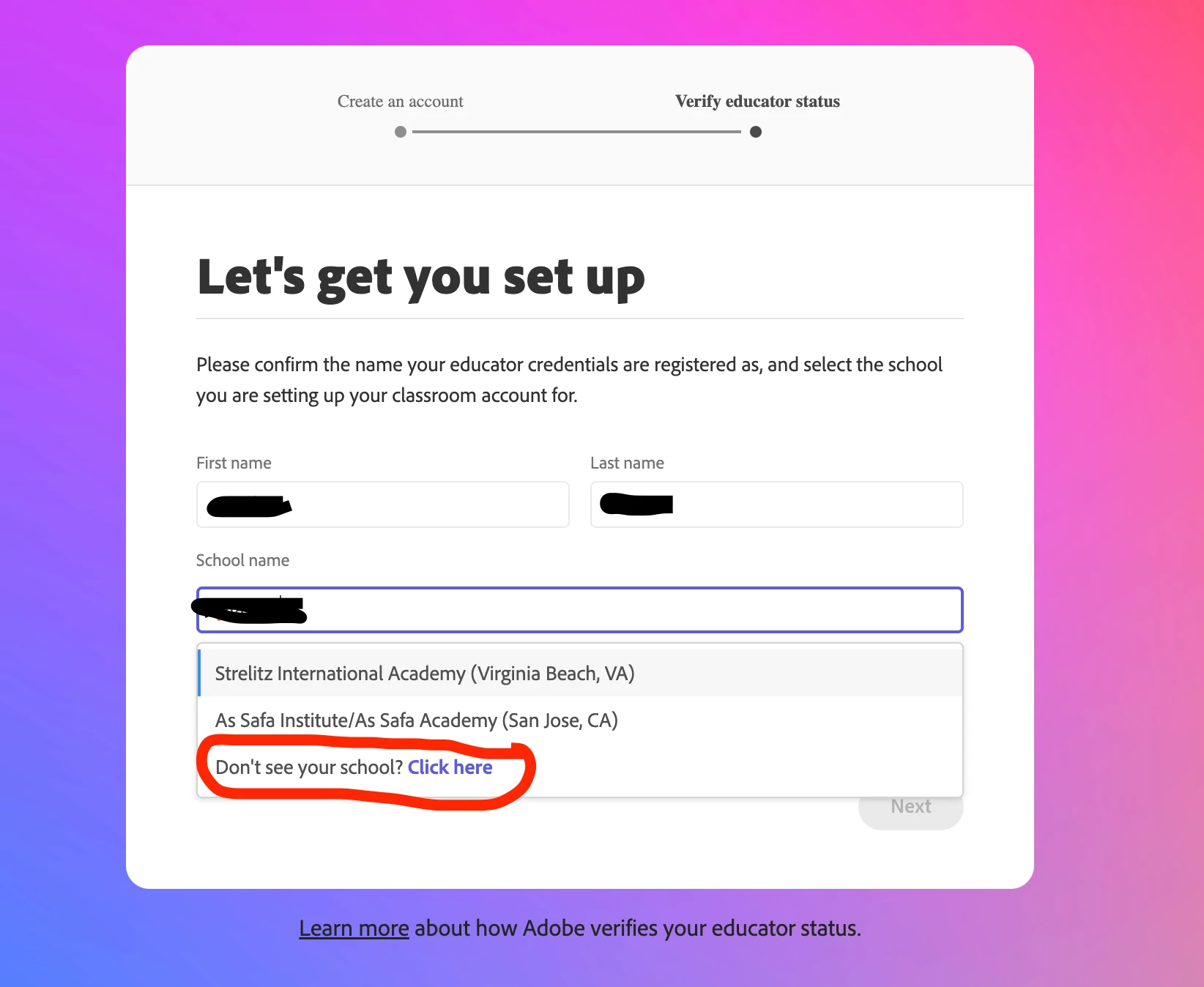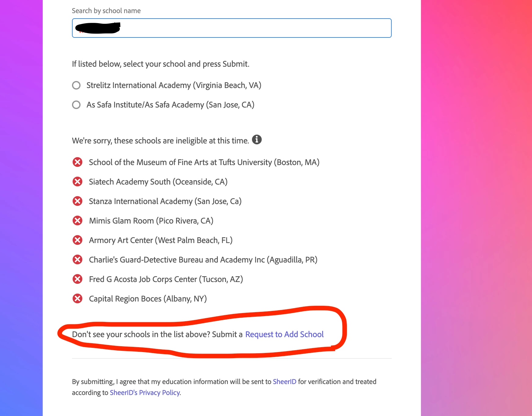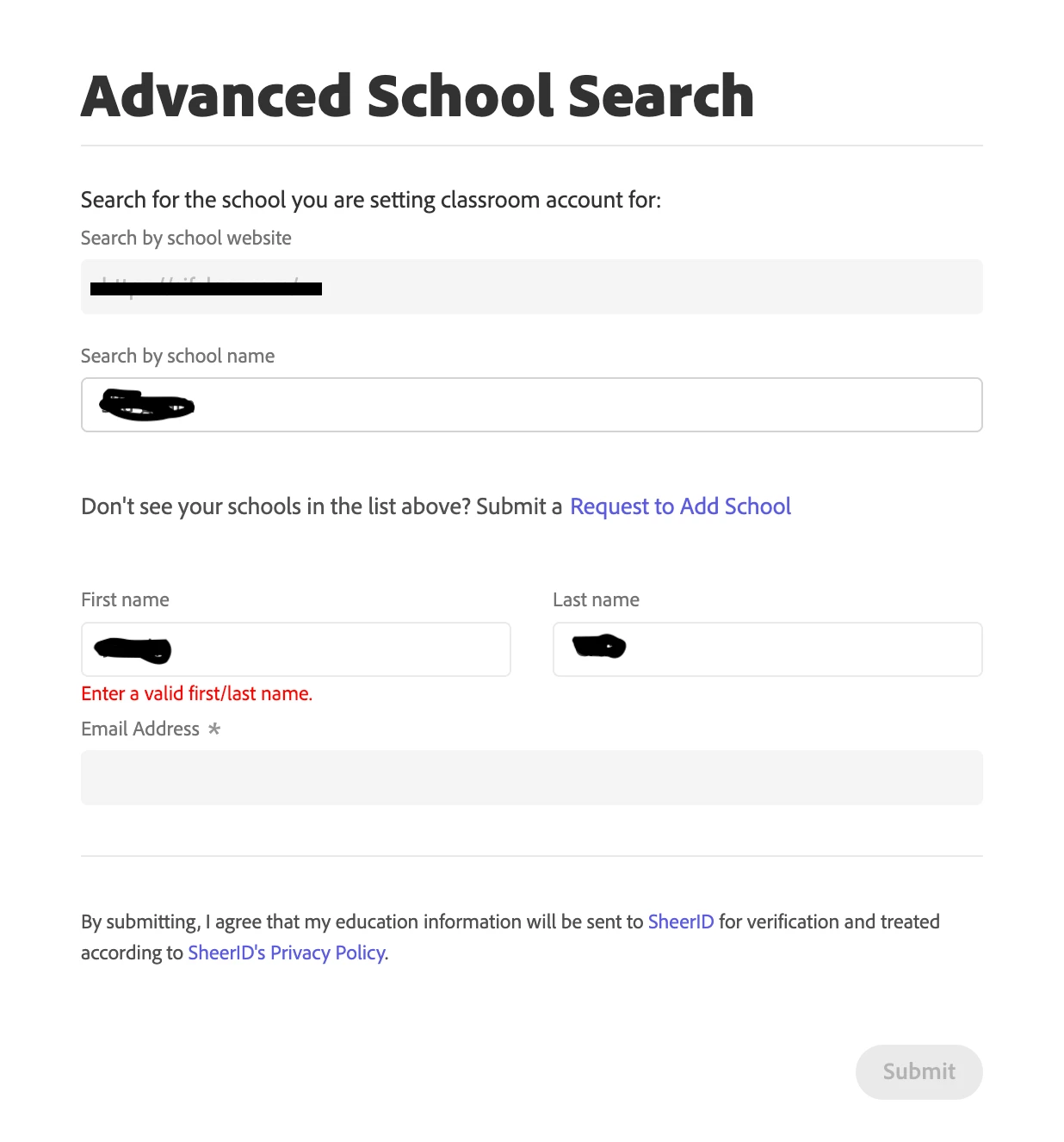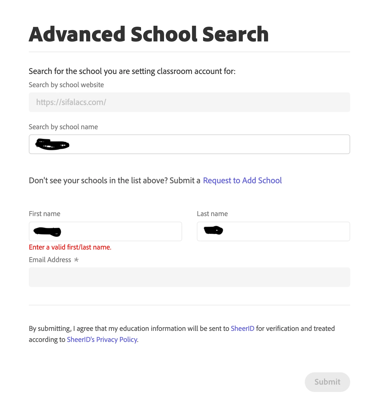 The issue is that my school is not recognized by the official list provided to Adobe, so I decided to request to add my school. But when I try to enter my first and last name, it keeps giving me the prompt "Enter a valid First/Last Name".
