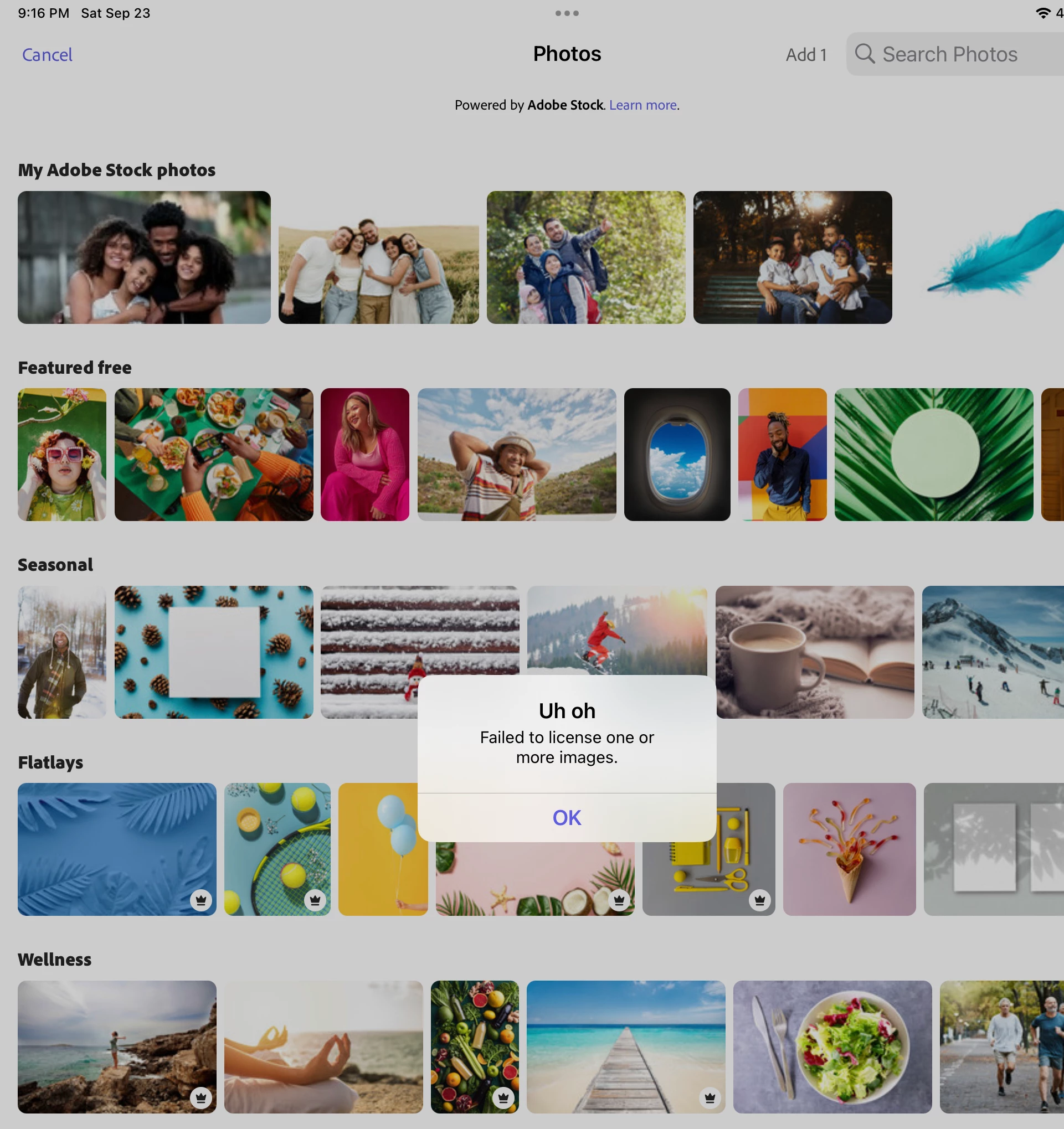 Receiving this error in Adobe Express iOS app "Failed to license one or more images" when I try to add a photo stock image to a project. I've had an active monthly full creative suite subscription for about 15 years. I use photo stock every week, never had an issue. Today I get this error. I've signed out of the app and signed back in. I've signed out, deleted the app, rebooted my iPhone, reinstalled the app, signed back in and still have the same error. What's up with this?