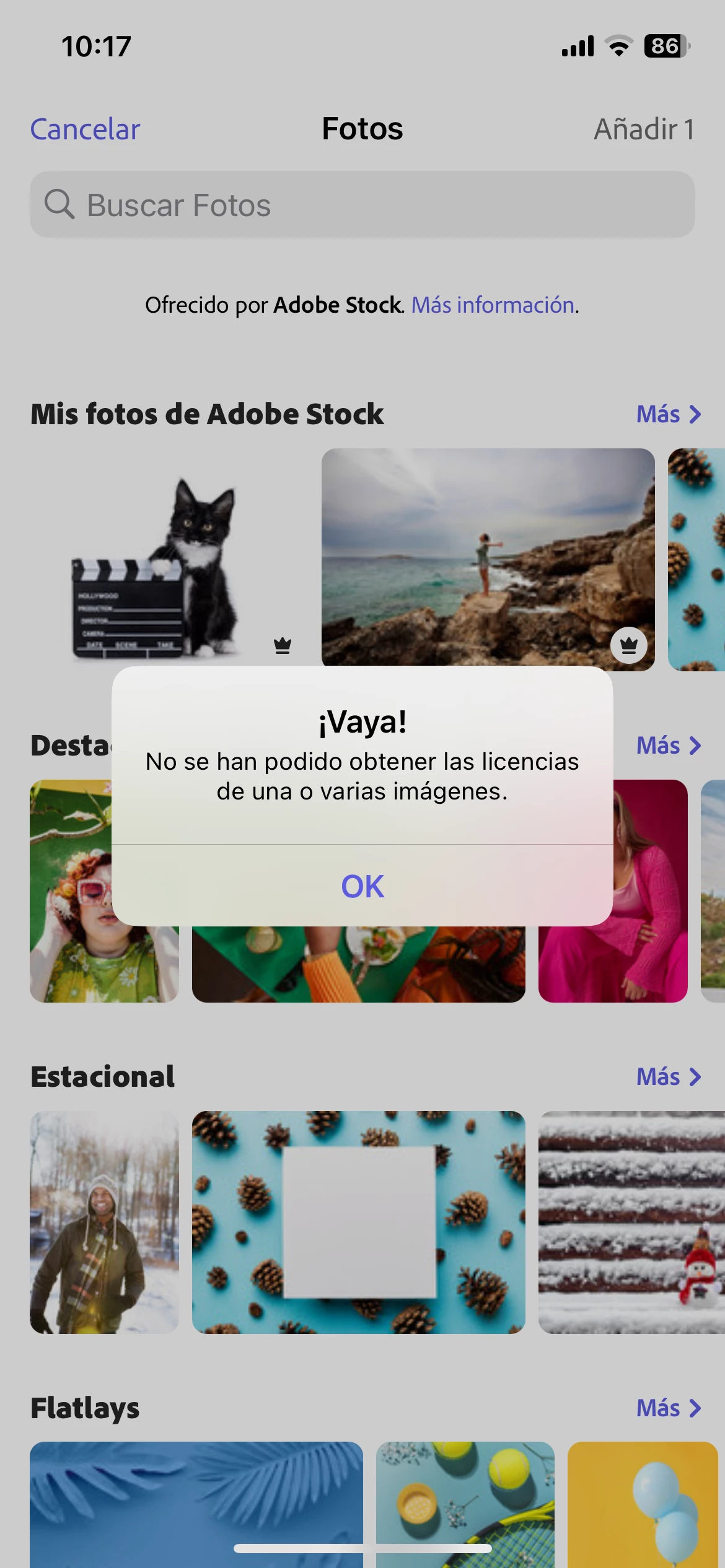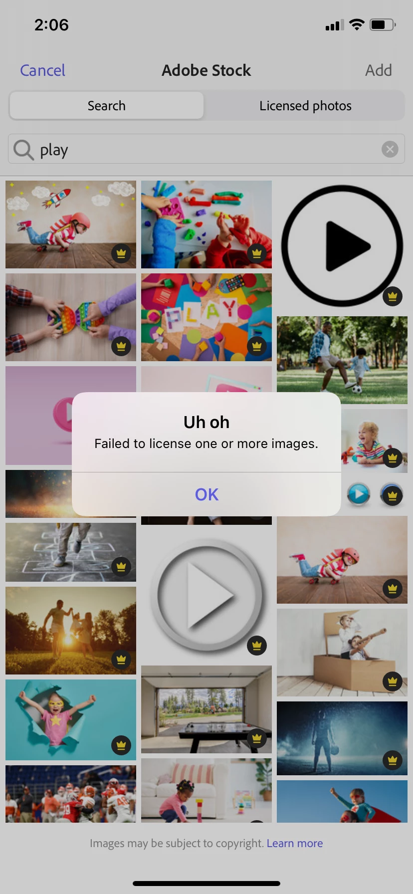 When trying to create a project and I go to select a photo from the Adobe Stock, one with a crown on it, I get a prompt that says, "Uh Oh failed to license one or more images." I attached a picture of it.