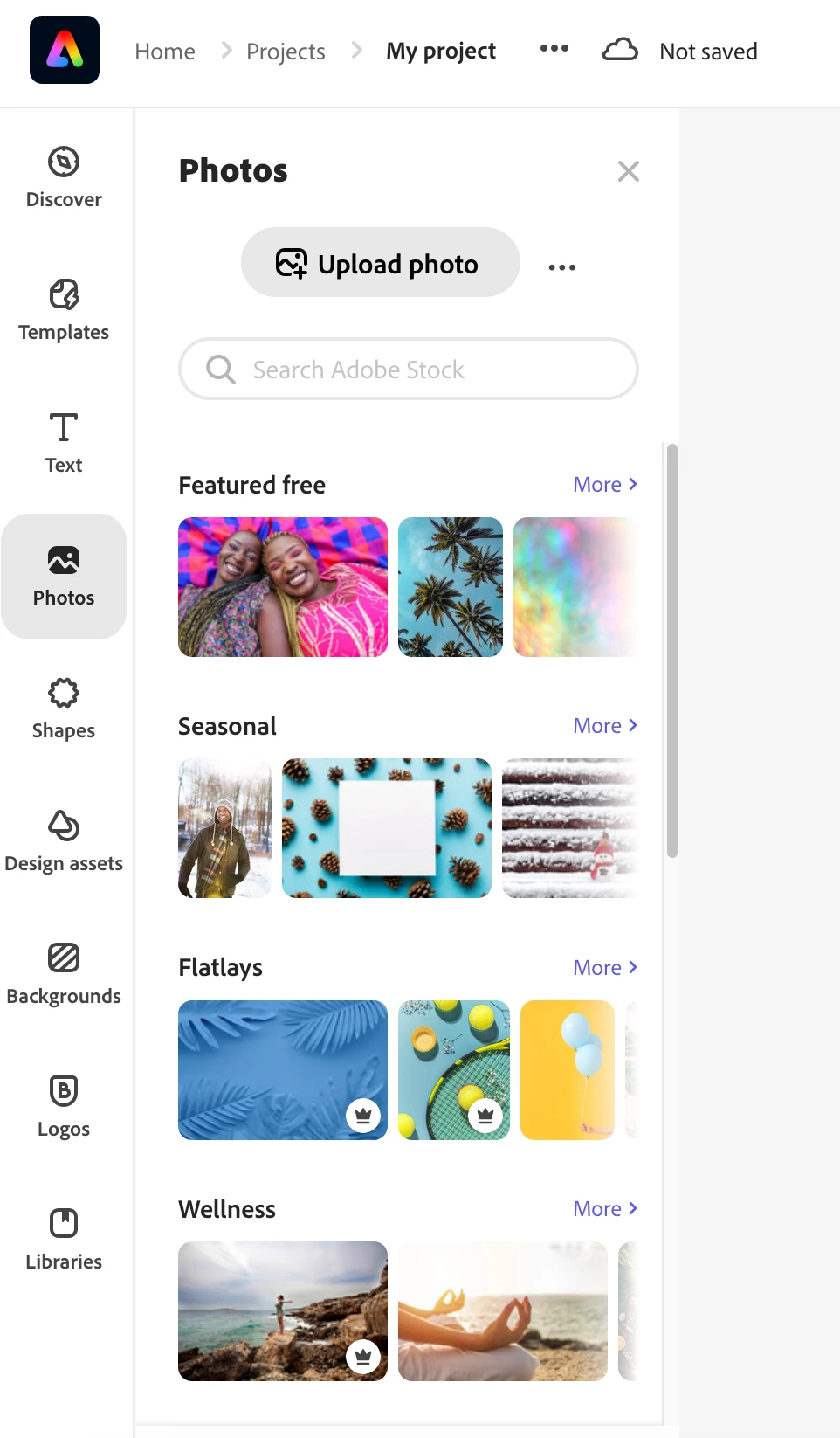 When you are creating an Adobe Express project the content within, Photos, Share, Design assets, backgrounds, etc. comes from Adobe Stock.