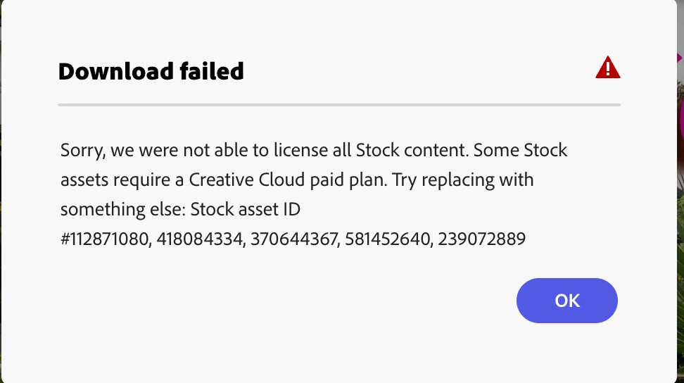 When trying to create a project and I go to select a photo from the Adobe Stock, one with a crown on it, I get a prompt that says, "Uh Oh failed to license one or more images." I attached a picture of it.
