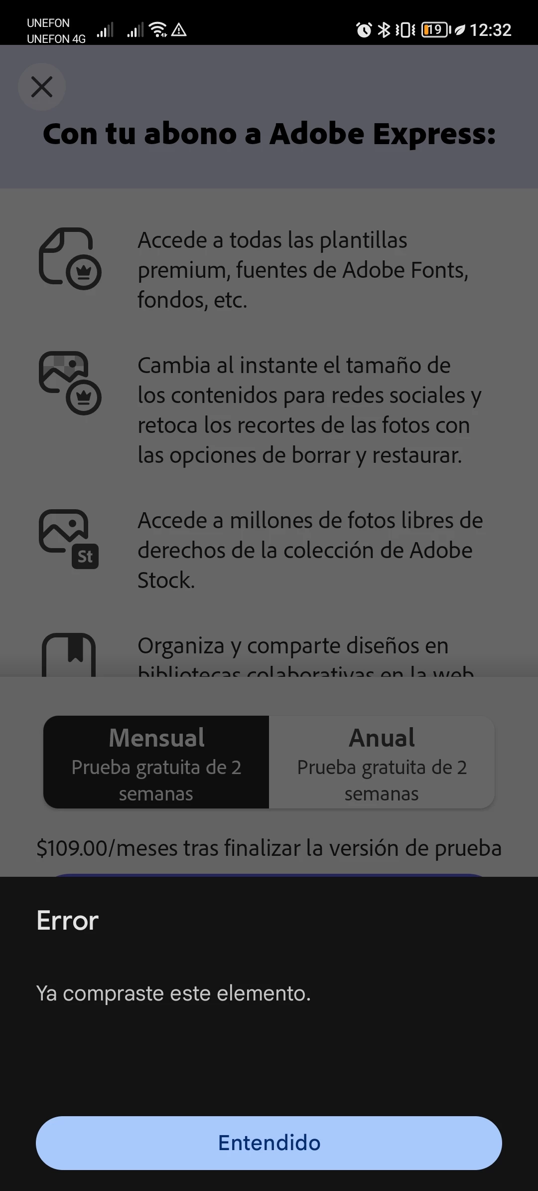 Alguien sabe porque carajos pago la suscripción de adobe y me dice que me inscriba ya borre el cache ya desinstale a cerré sesión en el celular y la reabri y sigue en lo mismo que pague mi suscripción le doy pagar y dice error ya compraste este elemento
