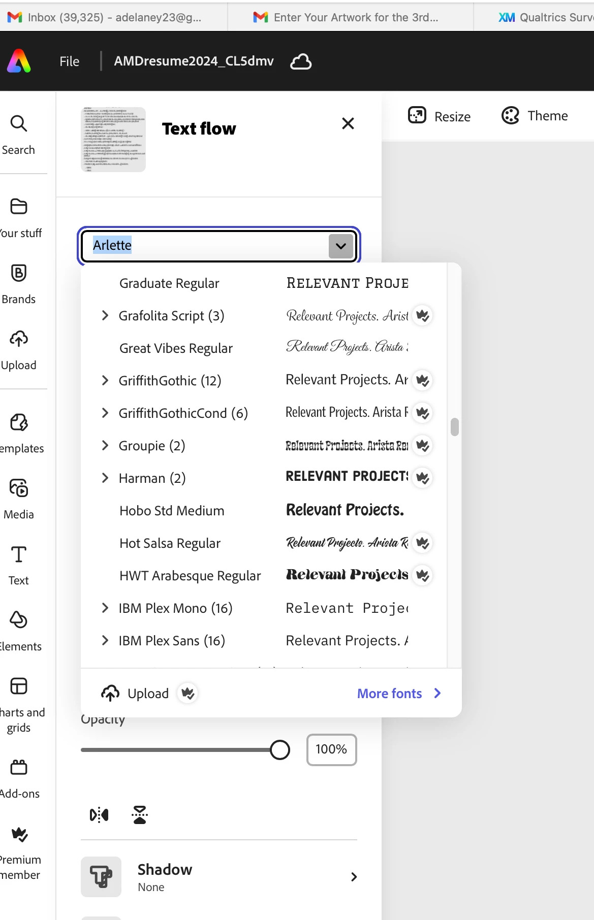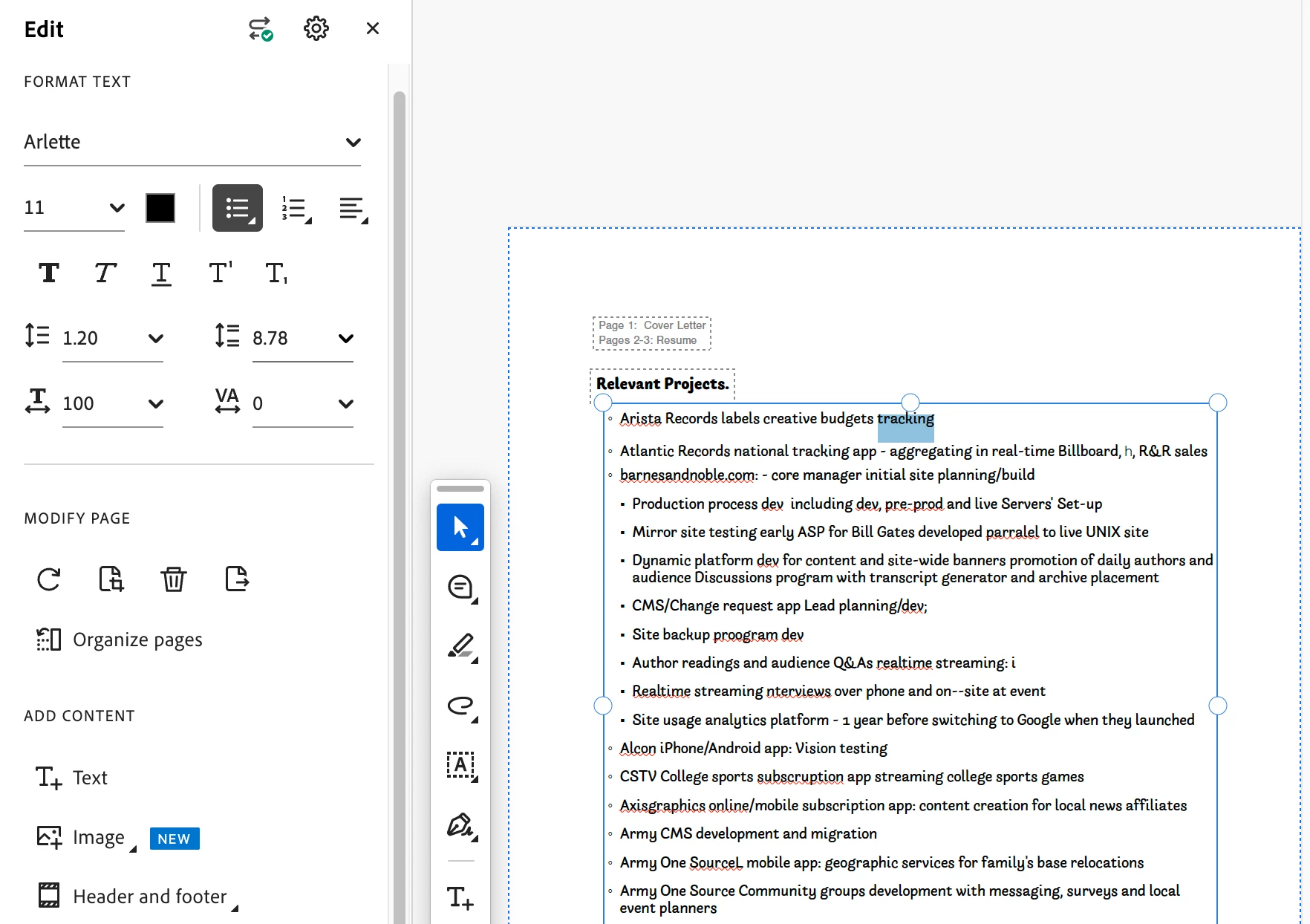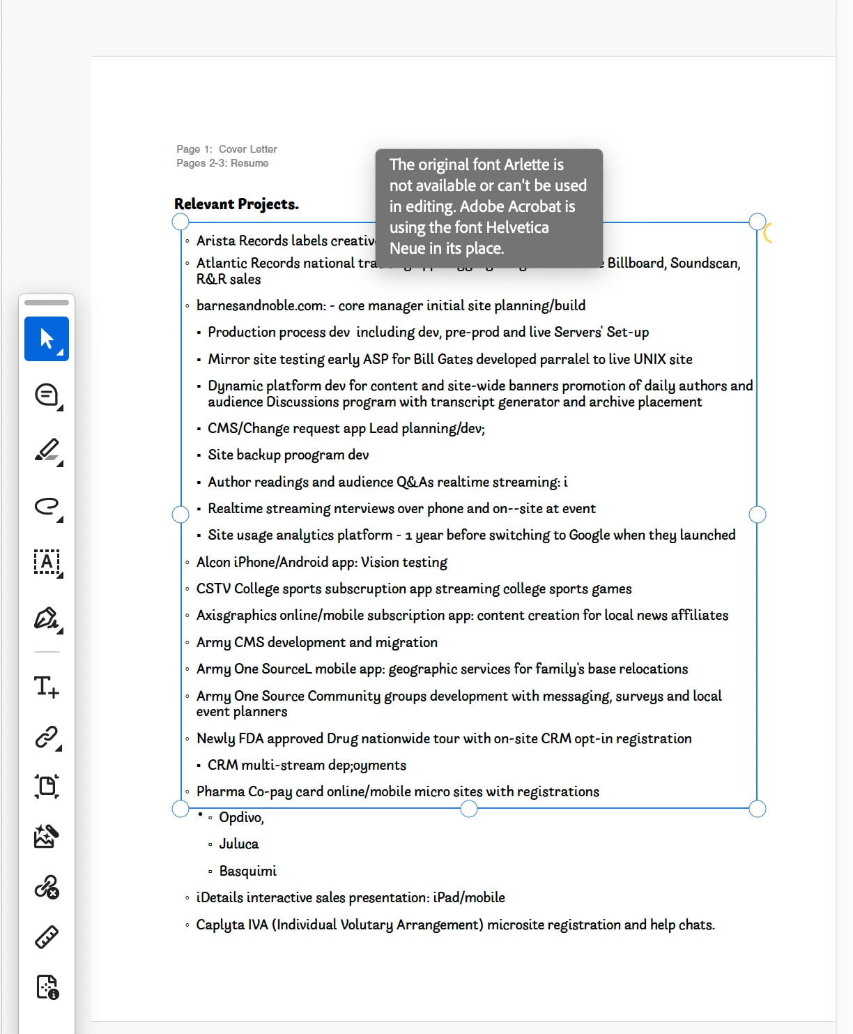 I had to make a few more text changes. Ii opened in Acrobat the PDF i had downloaded and selected EDIT mode. When i tried to adjust a line of text , I got a message telling me the font i was forced to chose in STYLING is not accessible in PDF EDIT and Helvetica will be substituted. (see fontCHANGE screenshot) Helvetica was substituted for text i changed . the remaining text was still Arlette in the PDF (see arletteinPDF screenshot) - i call that a stupid mess.
